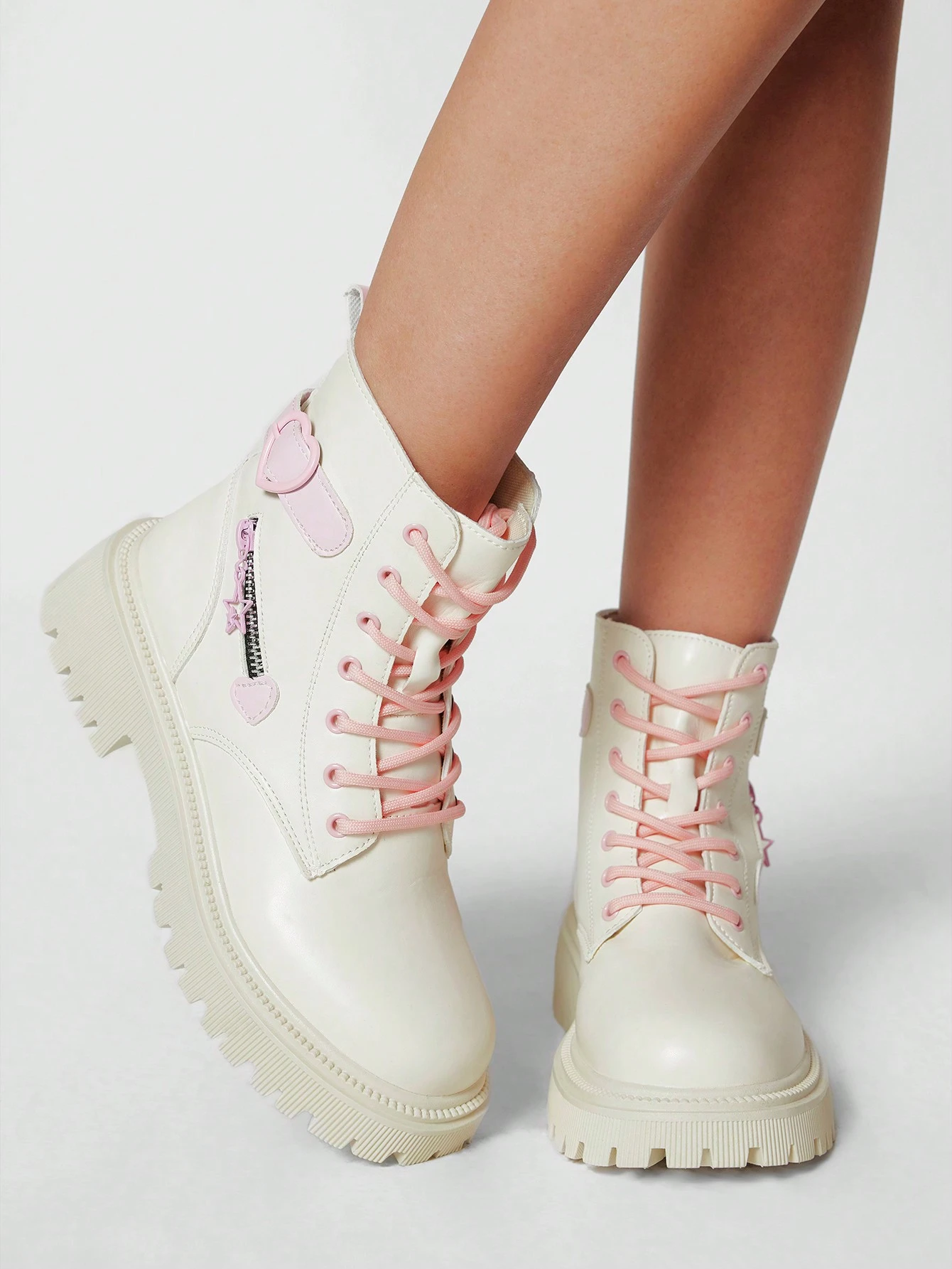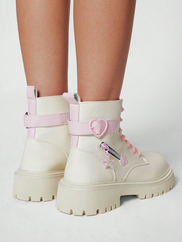 Kawaii Women's Pink Patchwork Round Toe Platform 5cm Retro British Style Fashion Daily Versatile Wedges, With Heart & Star Zipper Decoration, Japanese Student Boots, Suitable For Valentine's Day