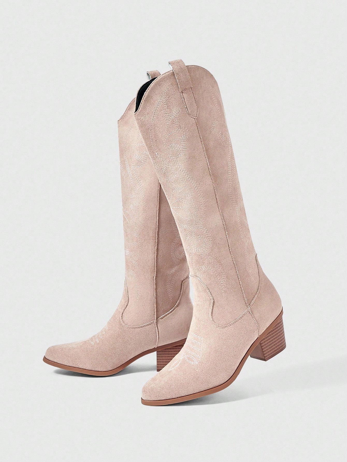 Kawaii Women's Plus Size Fashion Embroidered Western Cowboy Boots, Suede Lining, Slip-On Knee-High Boots, Autumn/Winter 2025 New Outdoor, Pink