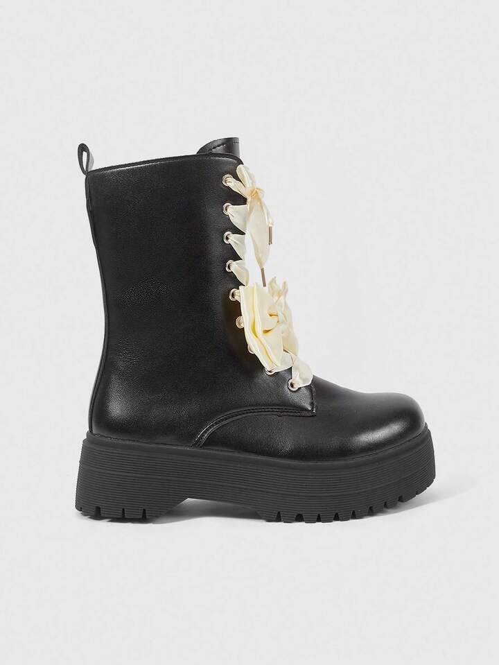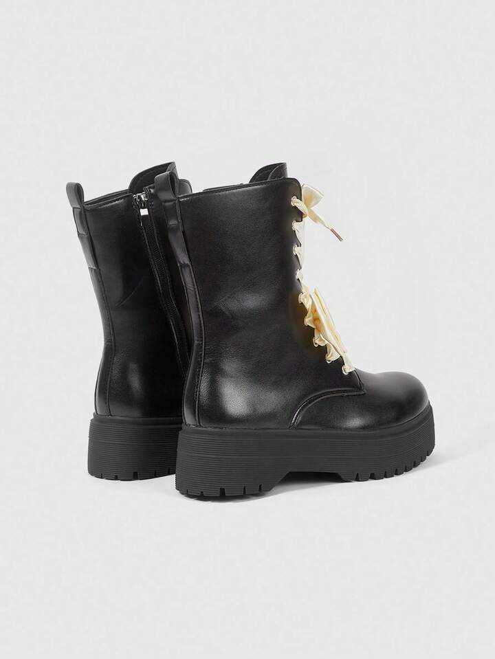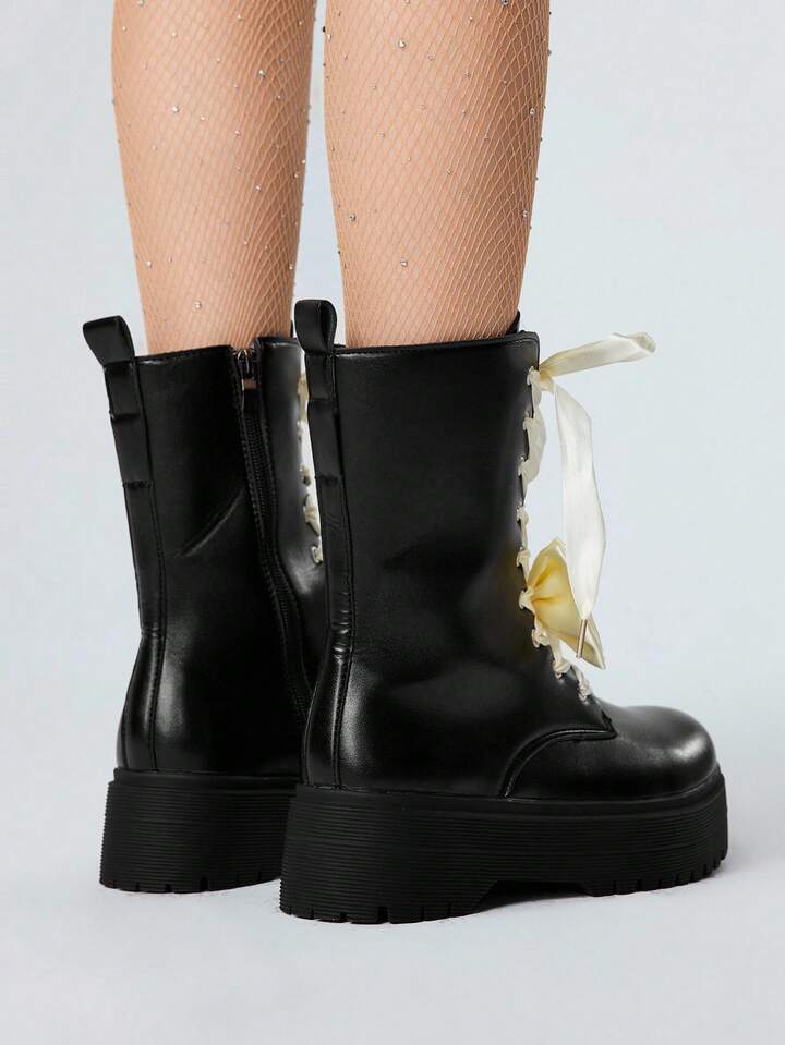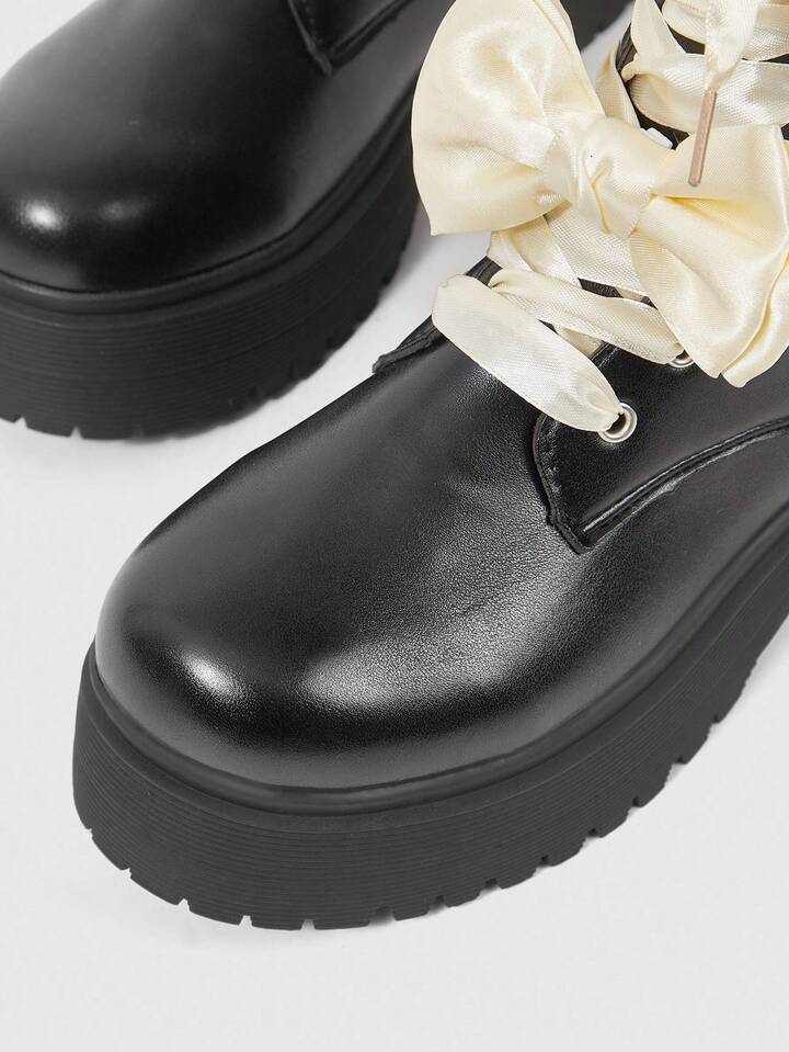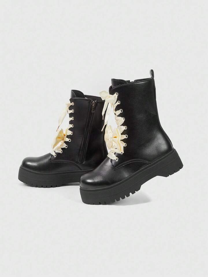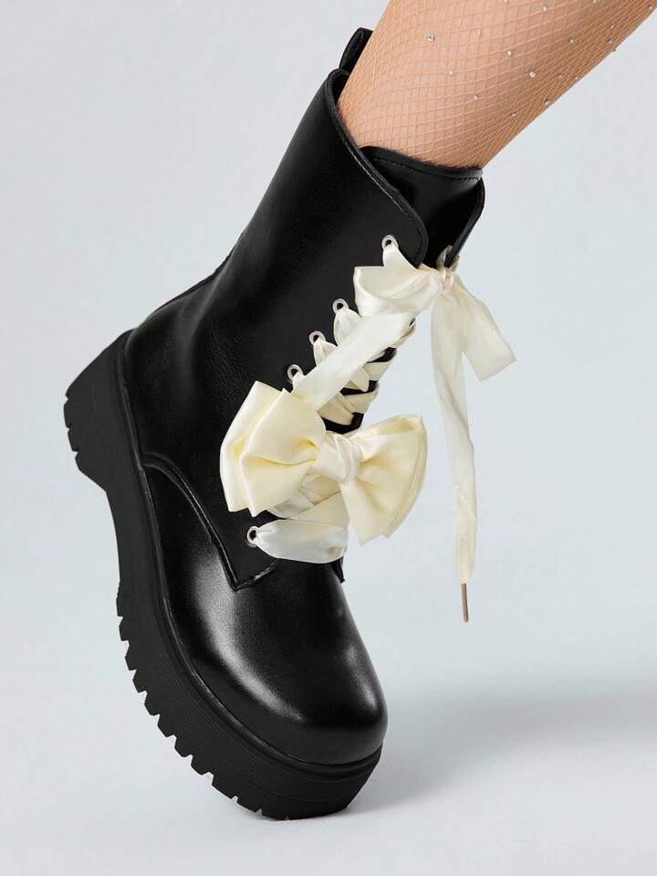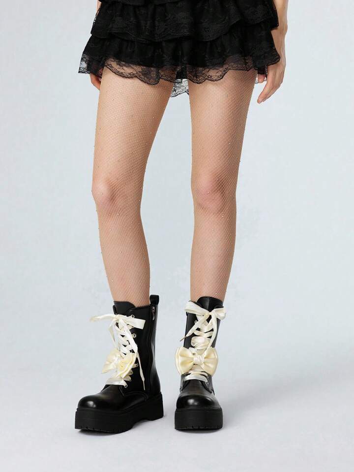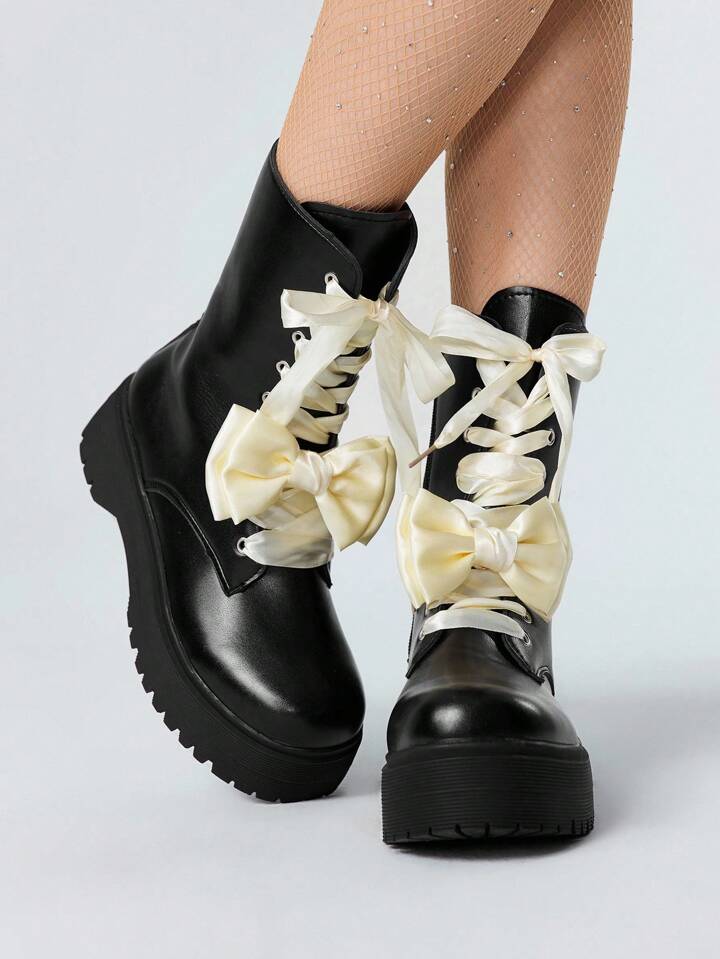 Kawaii Women's Punk Rock Gothic Lace-Up Motorcycle Boots, Platform Thick Sole Boots, Sweet Lace Bowknot Leather Ankle Boots And Short Boots
