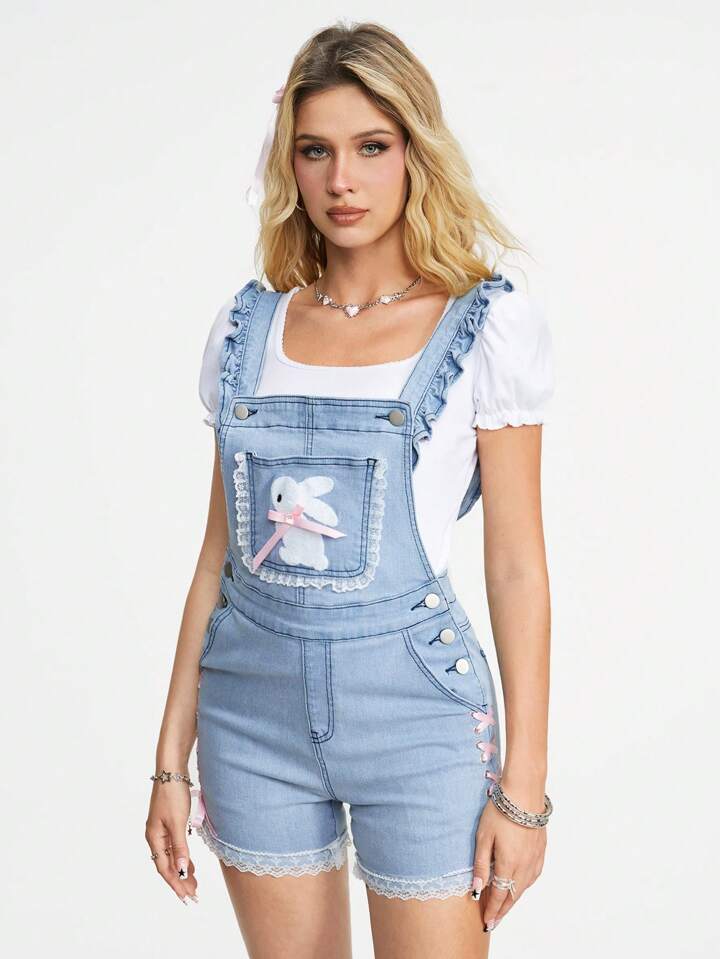 Kawaii Women's Rabbit Embroidery Ribbon Bow Cute Girl Ruffle Edge Denim Overalls