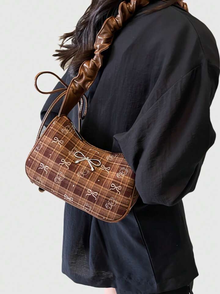Kawaii Women's Retro Plaid Color-Block Shoulder Bag With French Bow, Romantic & Elegant Underarm Bag, Suitable For Autumn/Winter