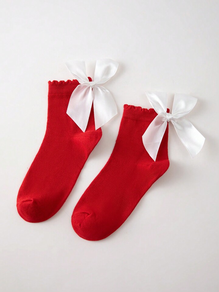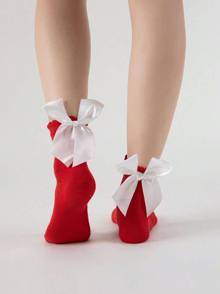 Kawaii Women's Solid Color Patchwork Bow Decor Simple Casual Mid-Calf Socks For Christmas