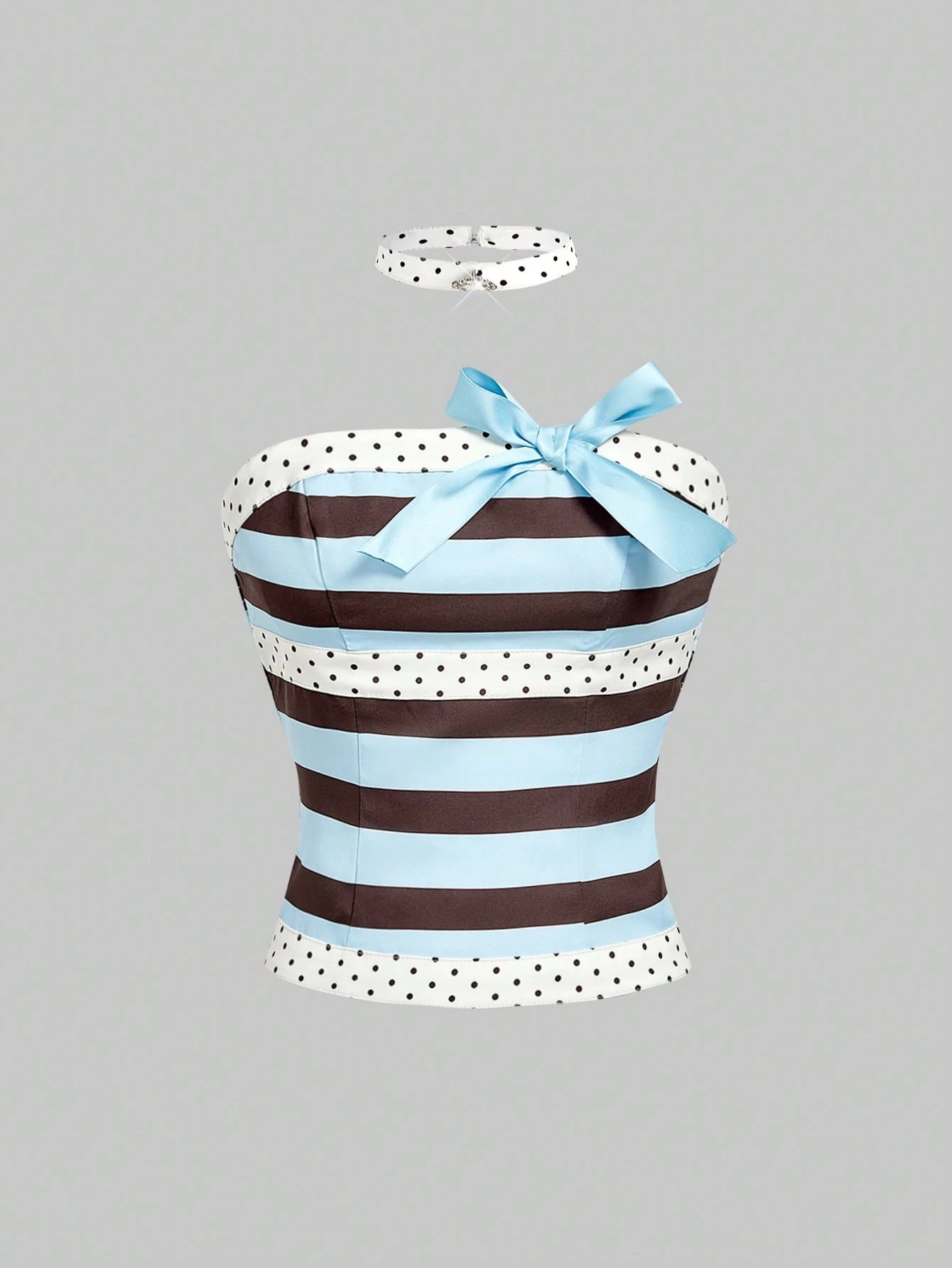 Kawaii Women's Striped Polka Dot Print Bow Decor Fashion Bandeau Top