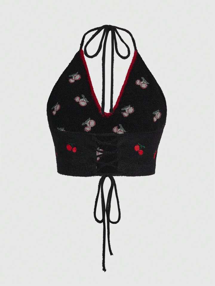 Kawaii Women's Sweet Cherry Embroidery Tie Strap Halter Knitted Top