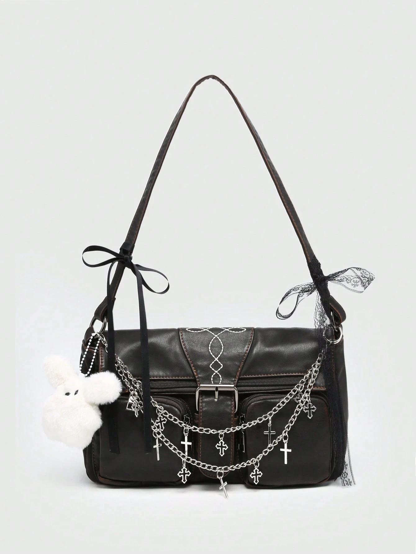 Kawaii Women's Vintage Distressed Ombre Camouflage Cross & Heart Pendant Decor Bowknot Strap Shoulder Tote Bag, Large Capacity Shoulder Bag With Multiple Pockets