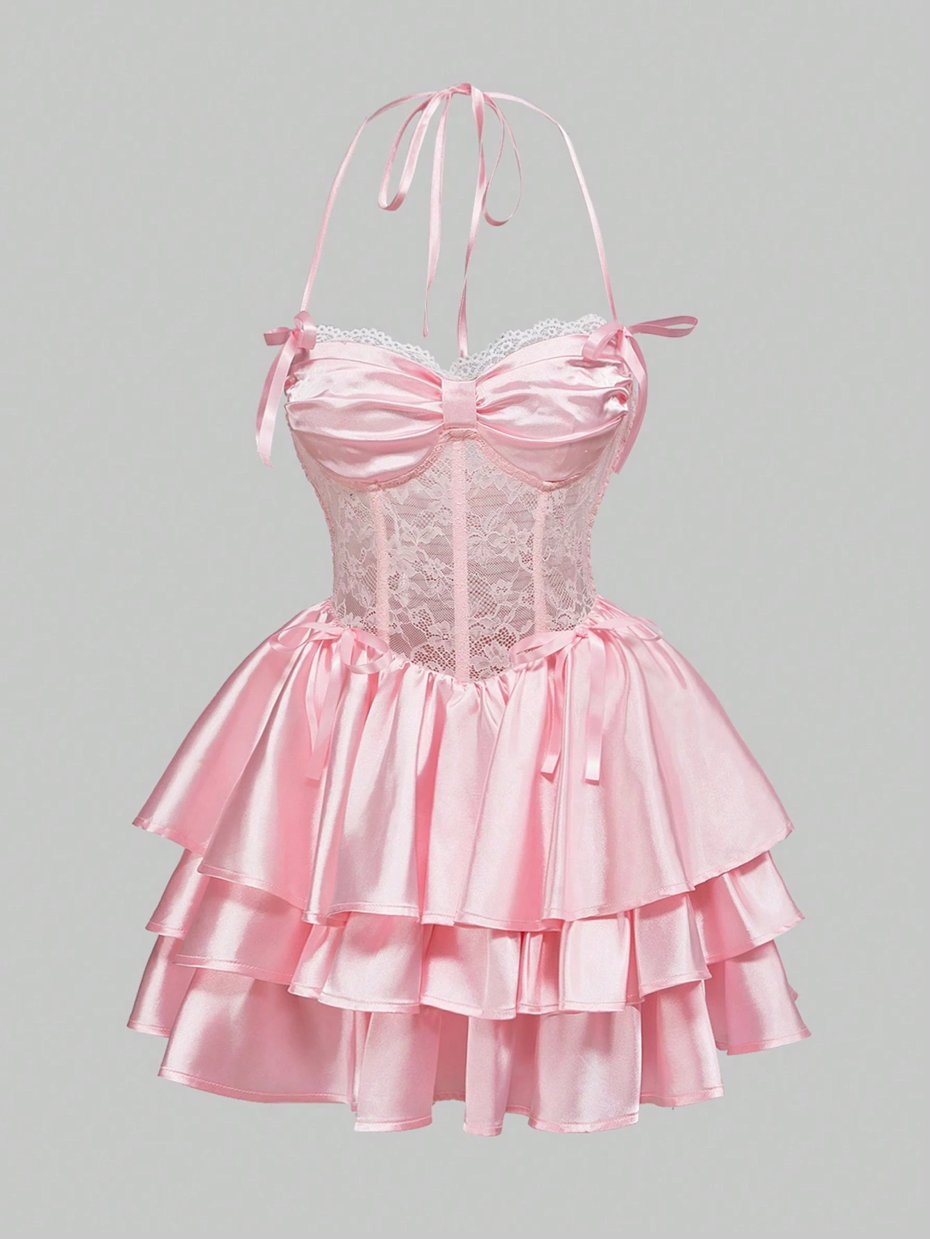 Kawaii Women's Vintage Elegant Romantic Palace Style Patchwork Lace Insert Ruffle Hem Bowknot Cake Dress Dress For Tea Party Outfit