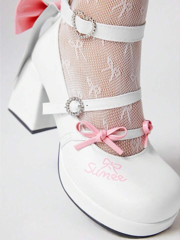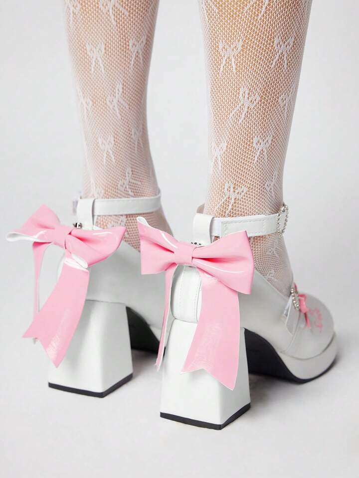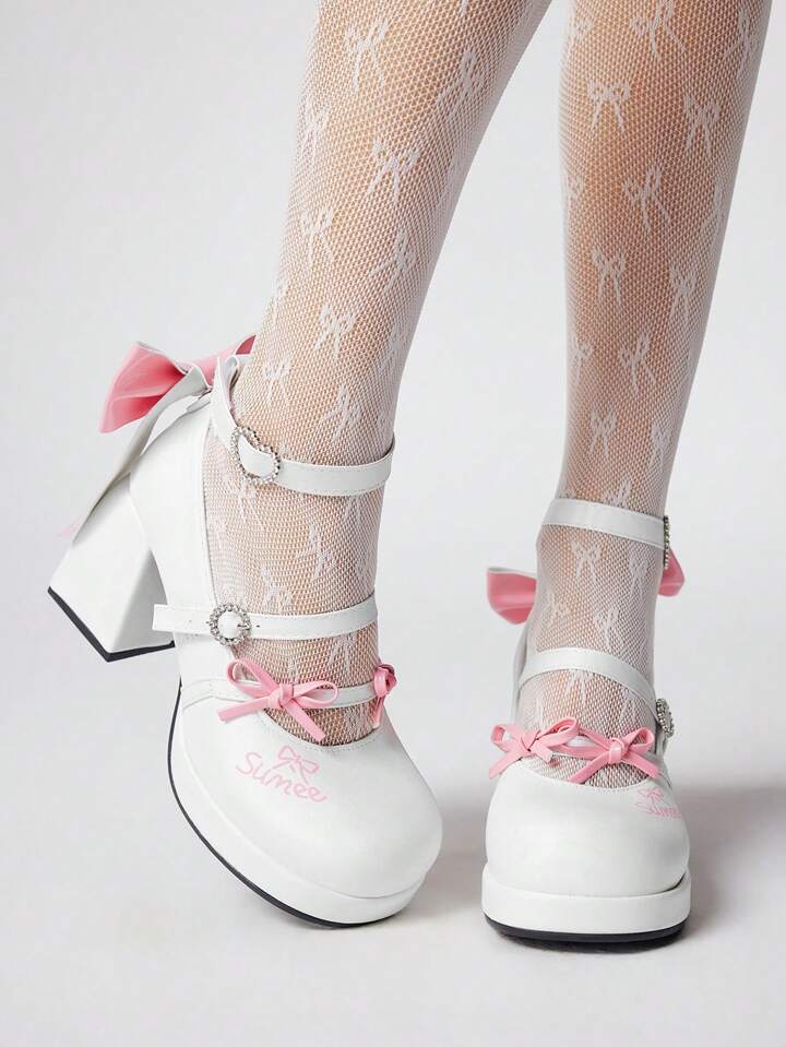 Kawaii Women's White Closed Toe Mary Jane Pumps, Thick Heel Bow Sweet Y2K Gothic Formal Dress Shoes