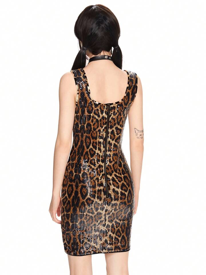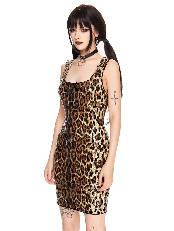 Kawaii Women's Y2K Square Neck Sequin Leopard Print Bodycon Mini Dress