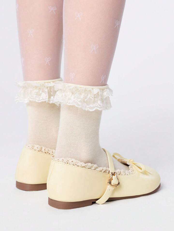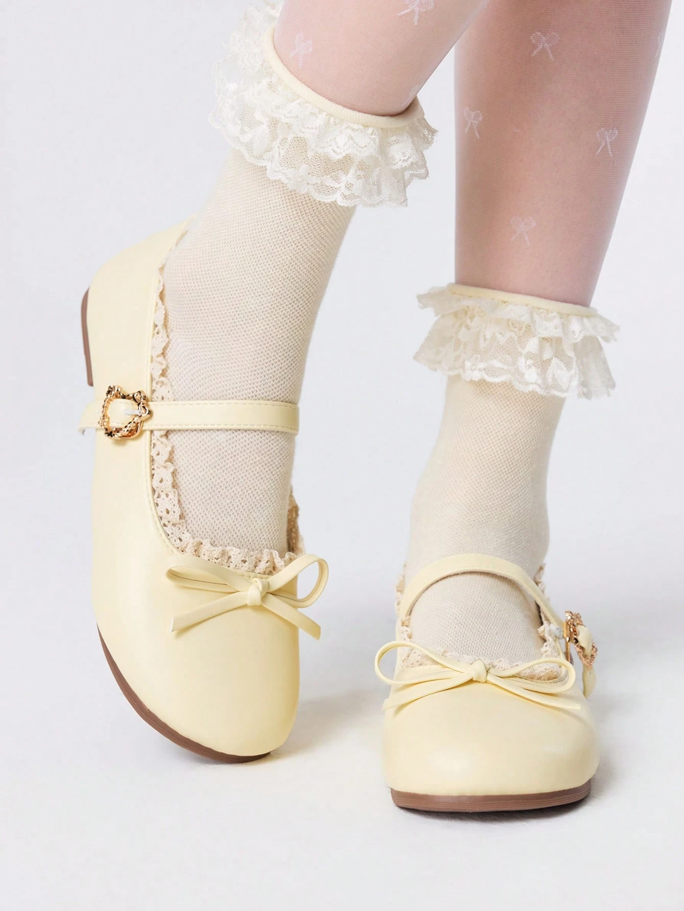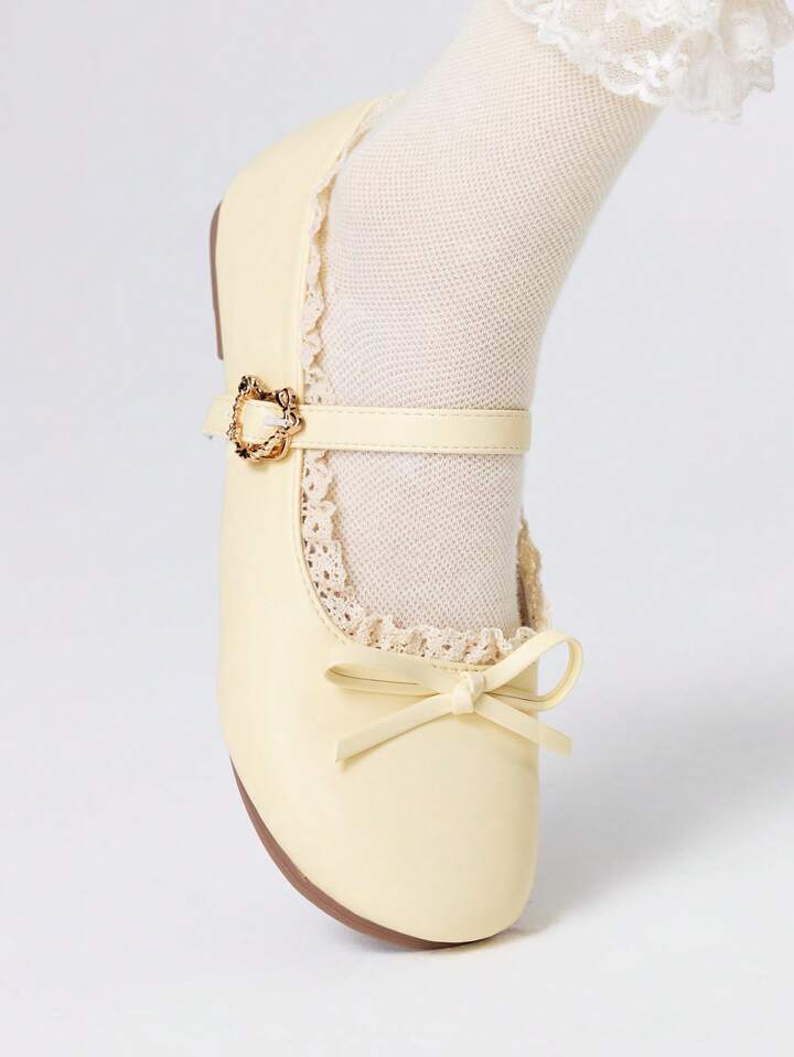 Kawaii Women's Yellow Loafers, Closed Toe Mary Jane Leather Shoes With Bow, Lolita Lace Ballet Flats