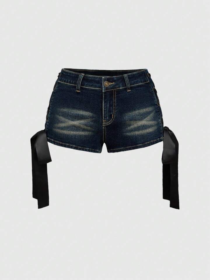 Kawaii Y2K Bowknot Side Tie Decor Low Waist Denim Mini Shorts