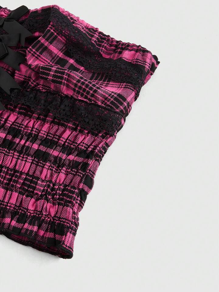 Kawaii Y2K Gyaru Himekaji Retro Sweet Plaid Halter Tie Front Top For Women