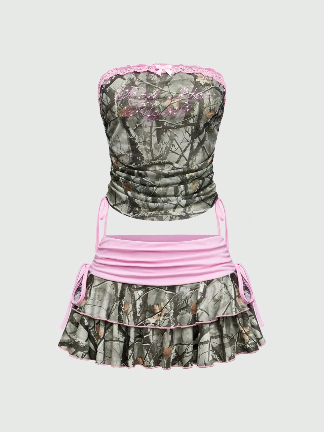 Kawaii Y2K Vintage American Casual Camouflage Mesh Rhinestone Drawstring Top And Ruffle Trim Mini Skirt 2 Pieces Set For Women