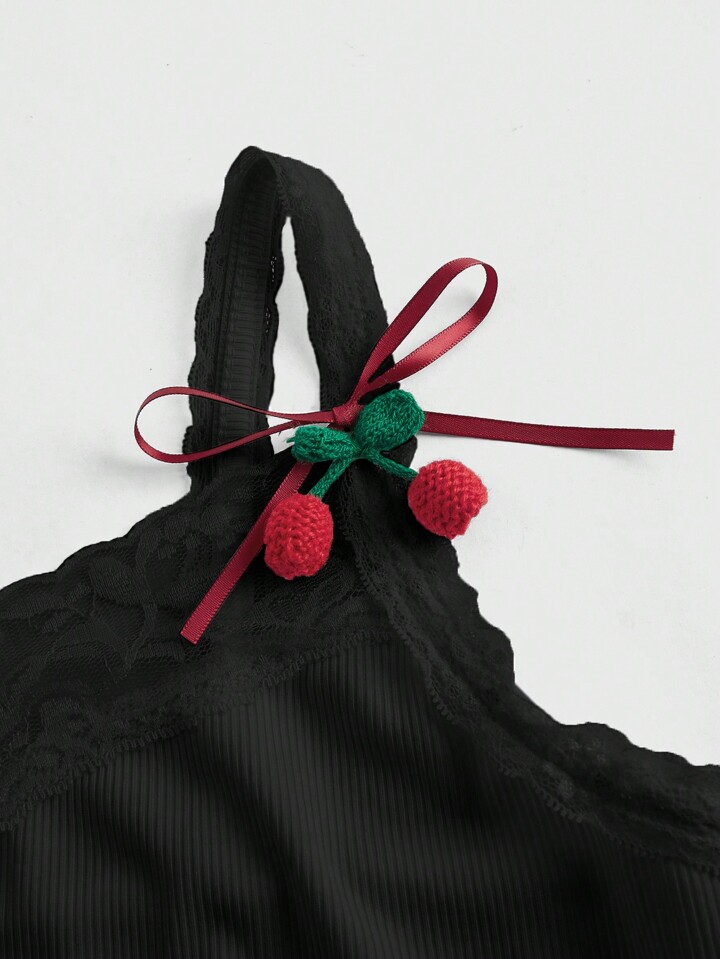 Kawaii Young Women's Casual Cherry Blossom Print Lace Trim Camisole Top With 3D Cherry Decor