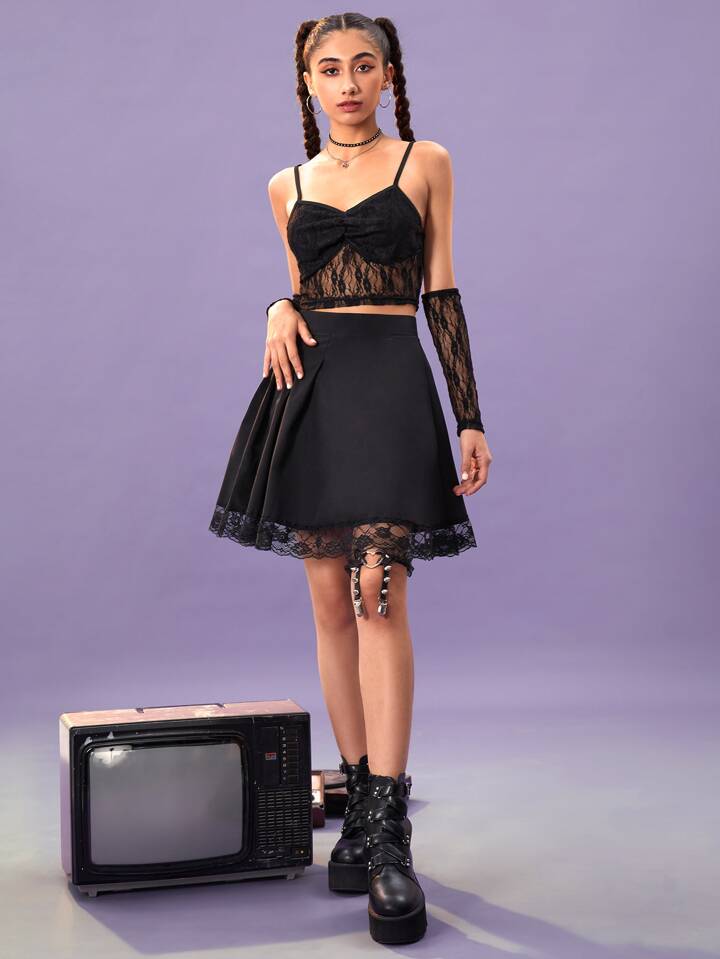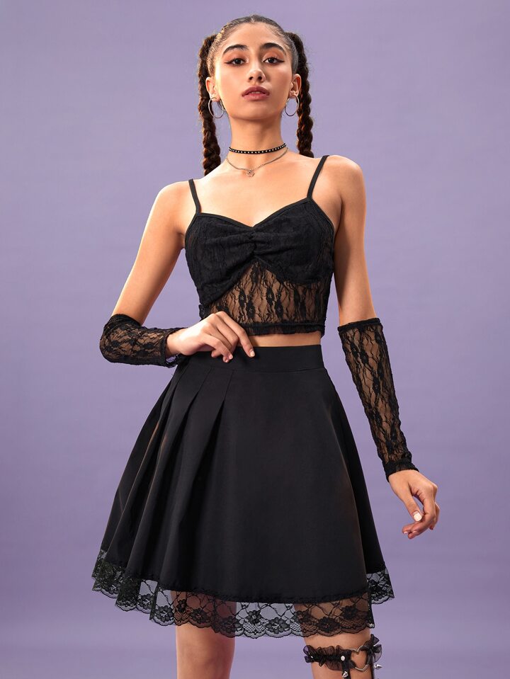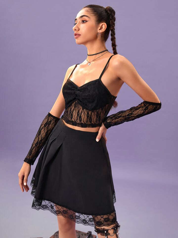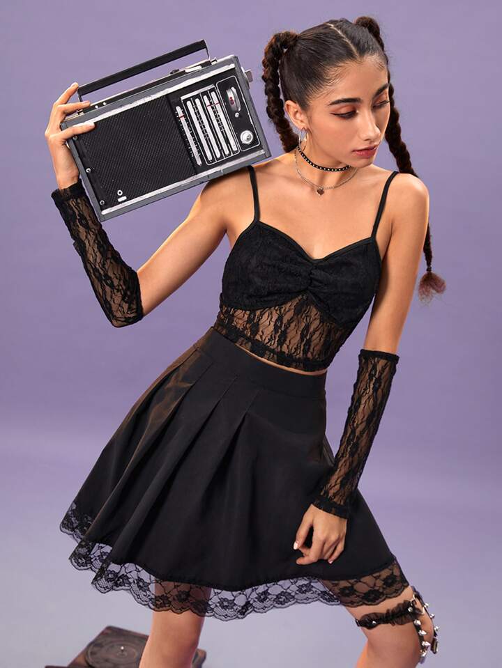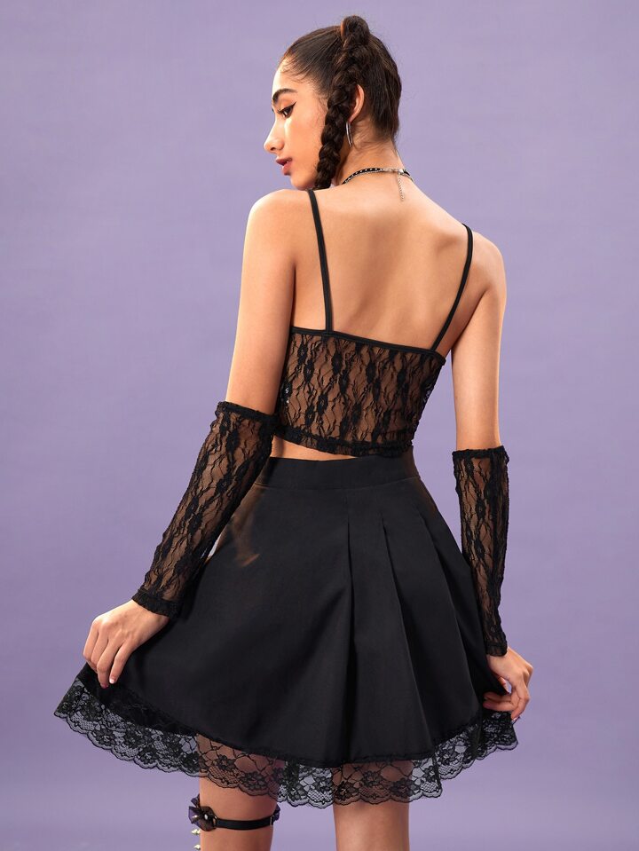 Lace Cami Top & Pleated Skirt With Oversleeves
