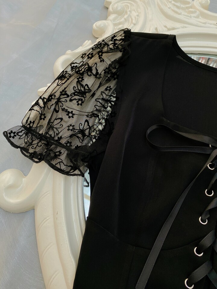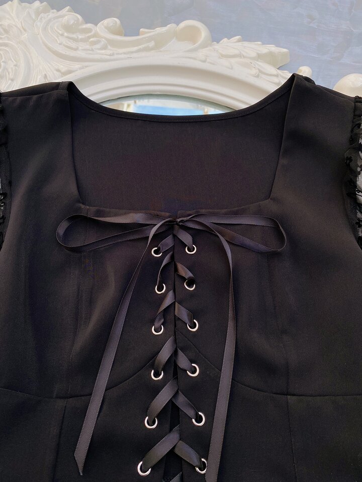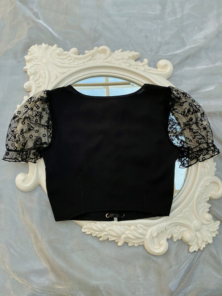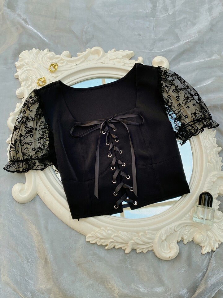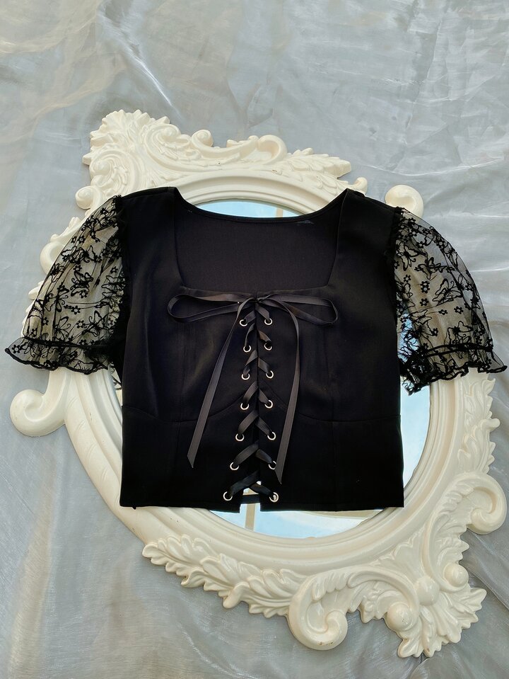 Lace Up Butterfly Puff Sleeve Blouse