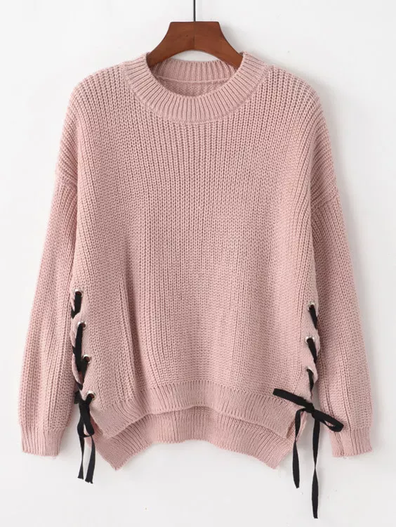 Lace Up Side Drop Shoulder High Low Sweater