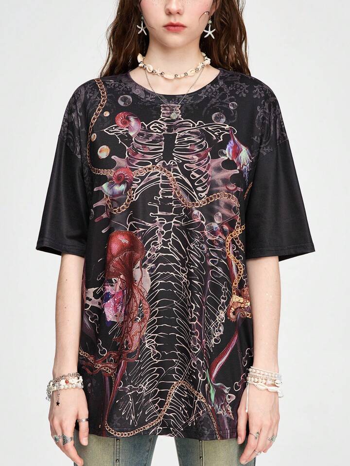 Ladies' Summer Fashionable Loose Short Sleeve T-Shirt With Skeleton Print