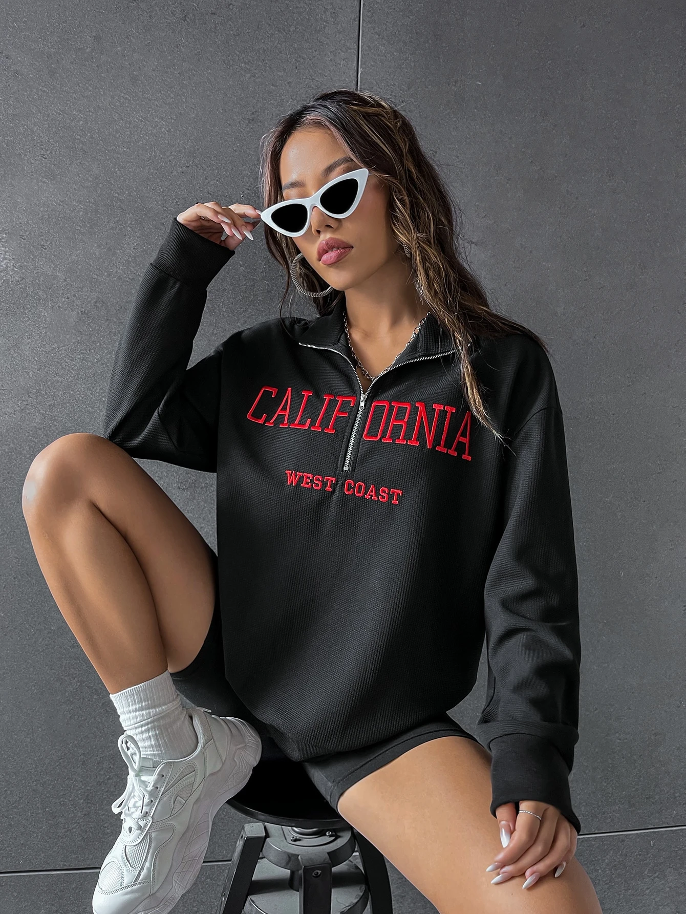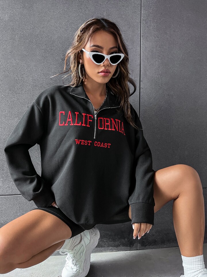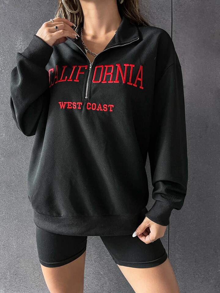Letter Embroidery Half Placket Drop Shoulder Sweatshirt
