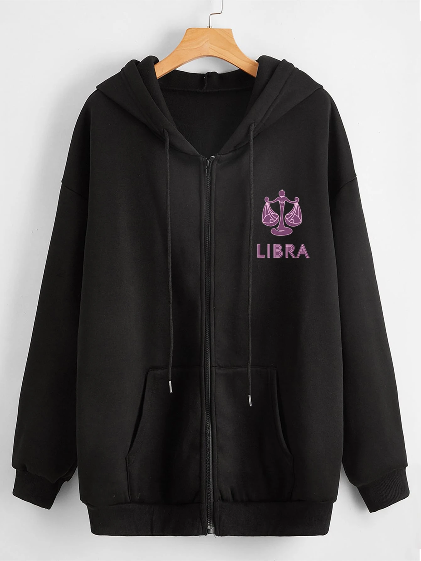 Letter Graphic Embroidery Zip Up Drawstring Hoodie