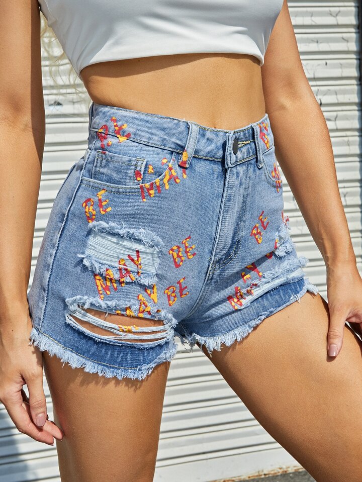 Letter Graphic Ripped Raw Hem Denim Shorts