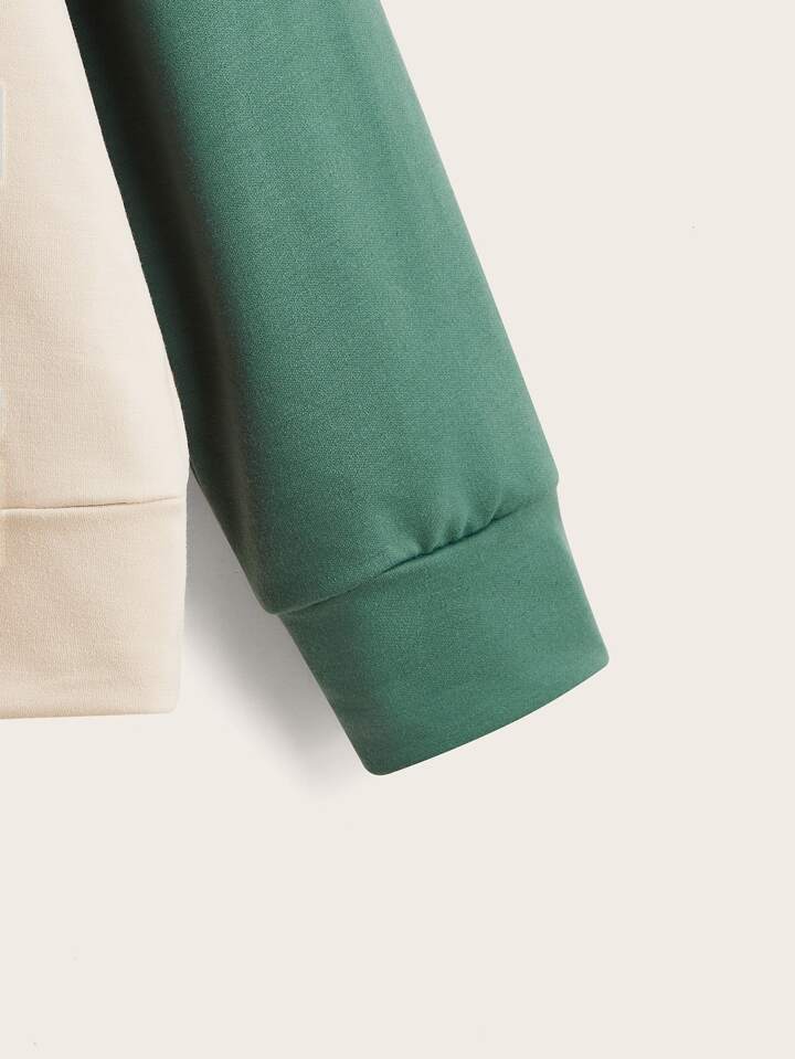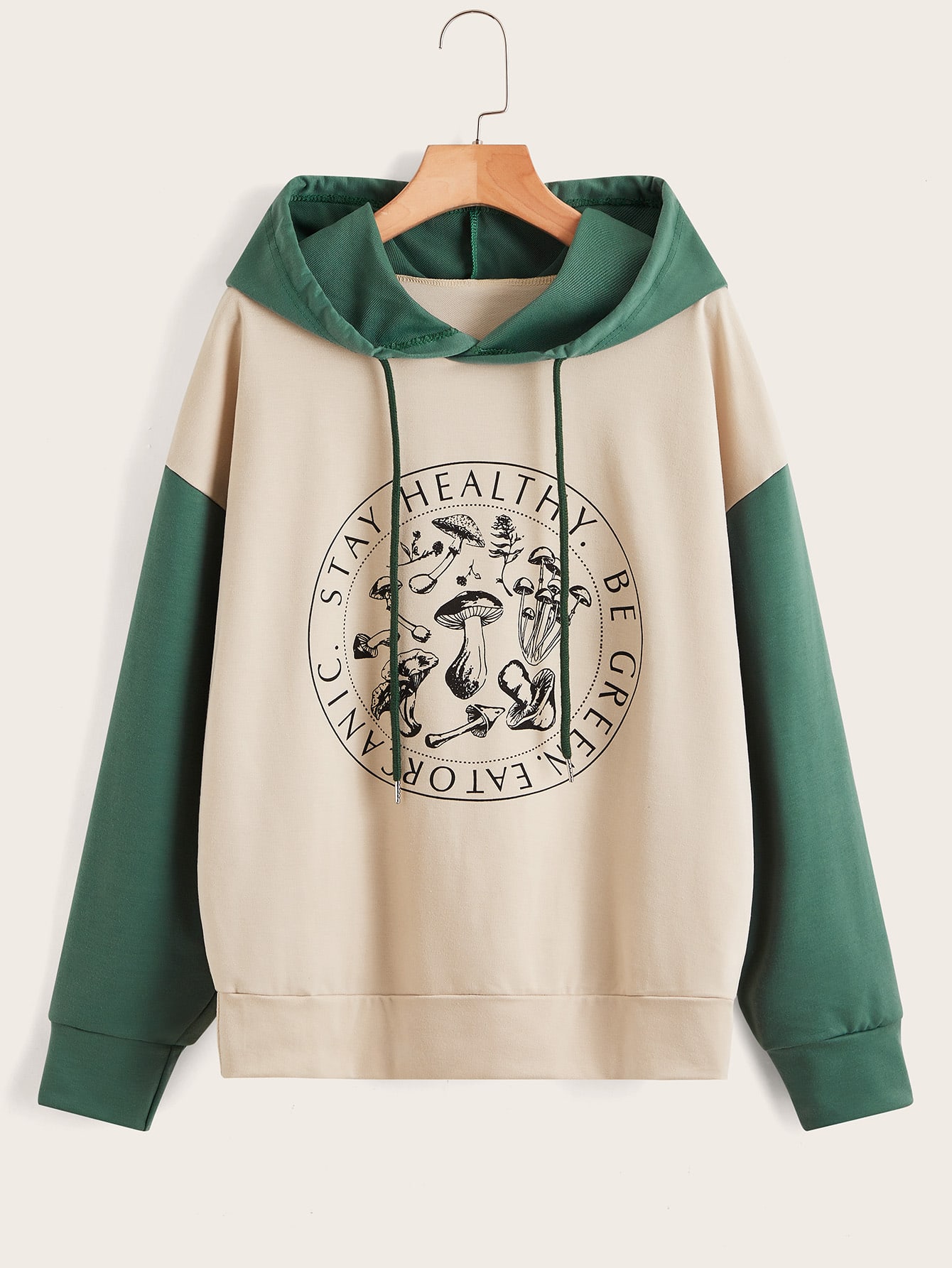 Letter Mushroom Graphic Colorblock Drawstring Hoodie