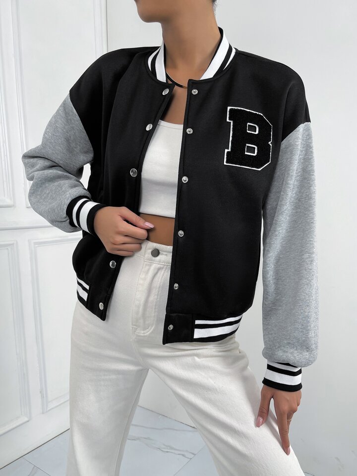 Letter Patched Striped Trim Drop Shoulder Varsity Jacket