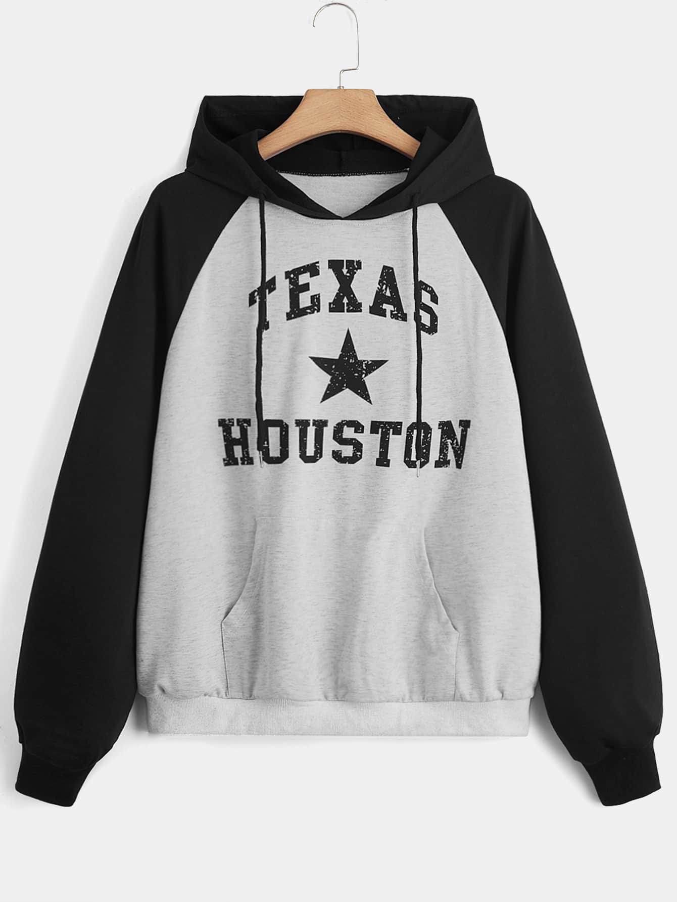 Letter & Star Print Raglan Sleeve Drawstring Hoodie