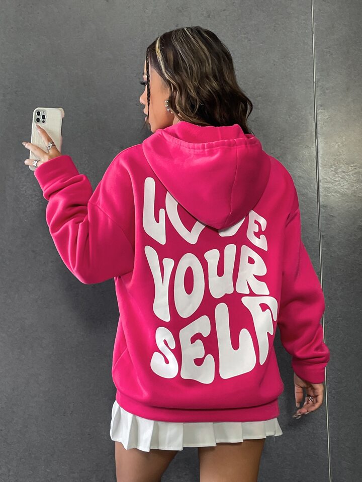 Love Yourself Distorted English Graphic Oversized Drop Shoulder Long Hoodie Sweatshirt