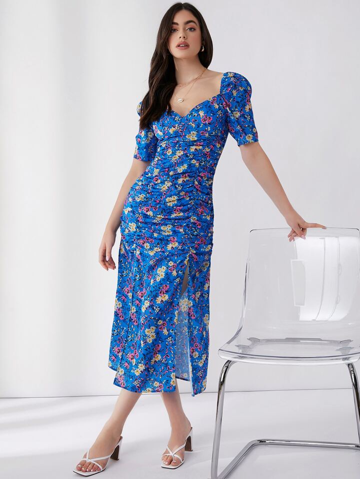M-slit Thigh Ruched Detail Allover Floral Print Dress