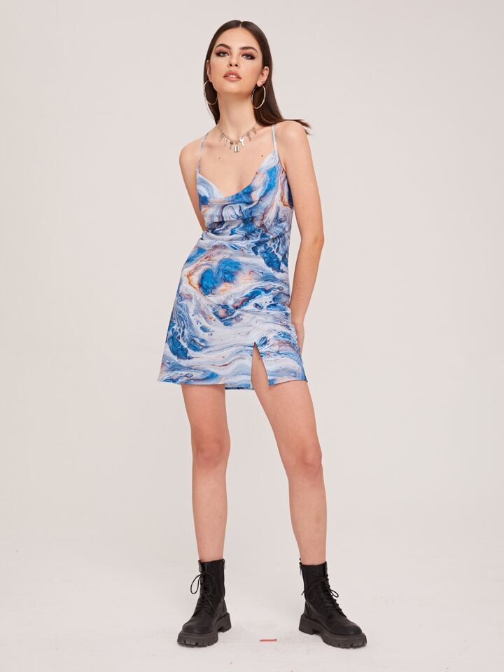 Marble Print Criss Cross Back Satin Cami Dress
