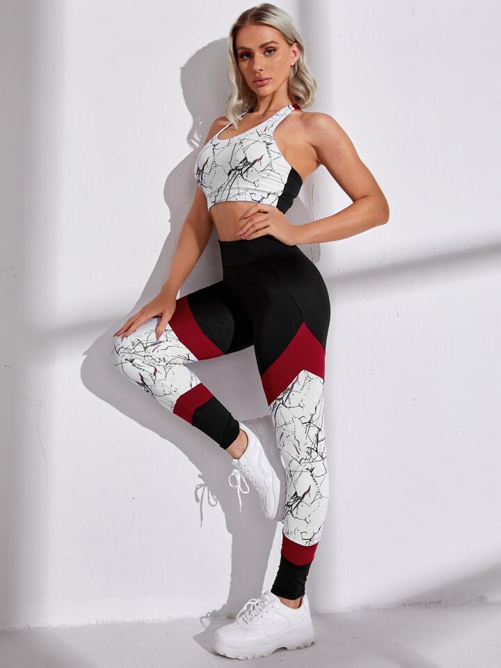 Marble Print Sports Bra & Colorblock Leggings