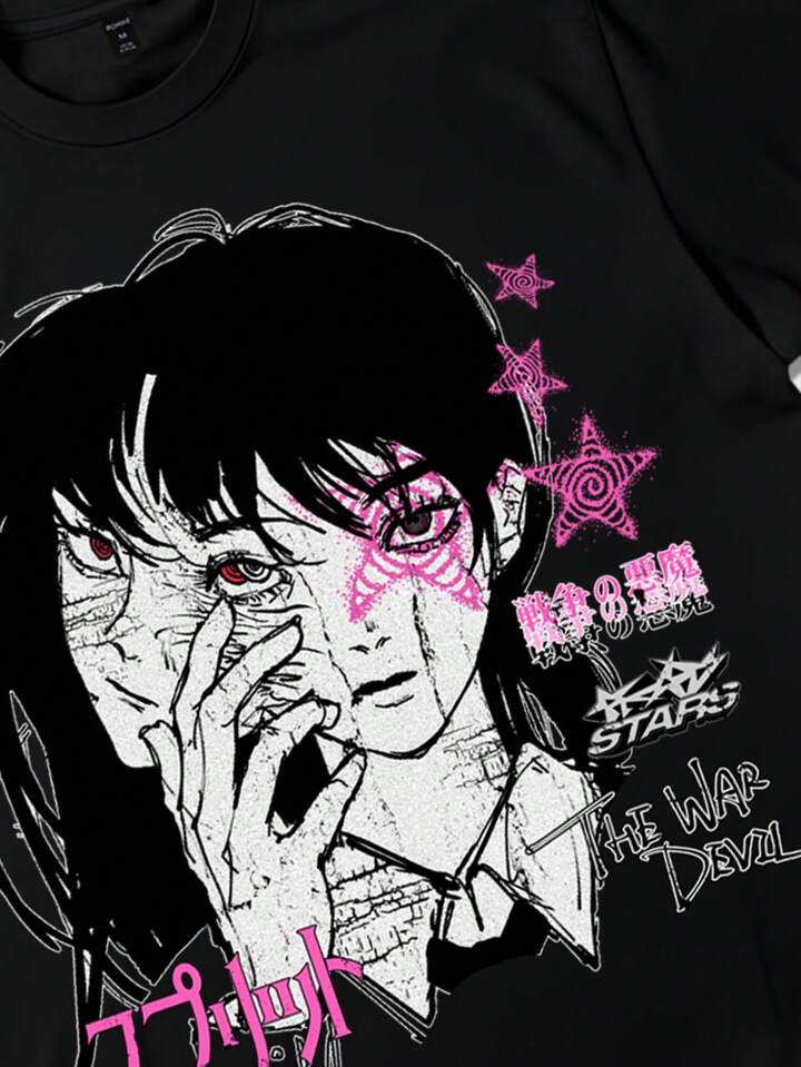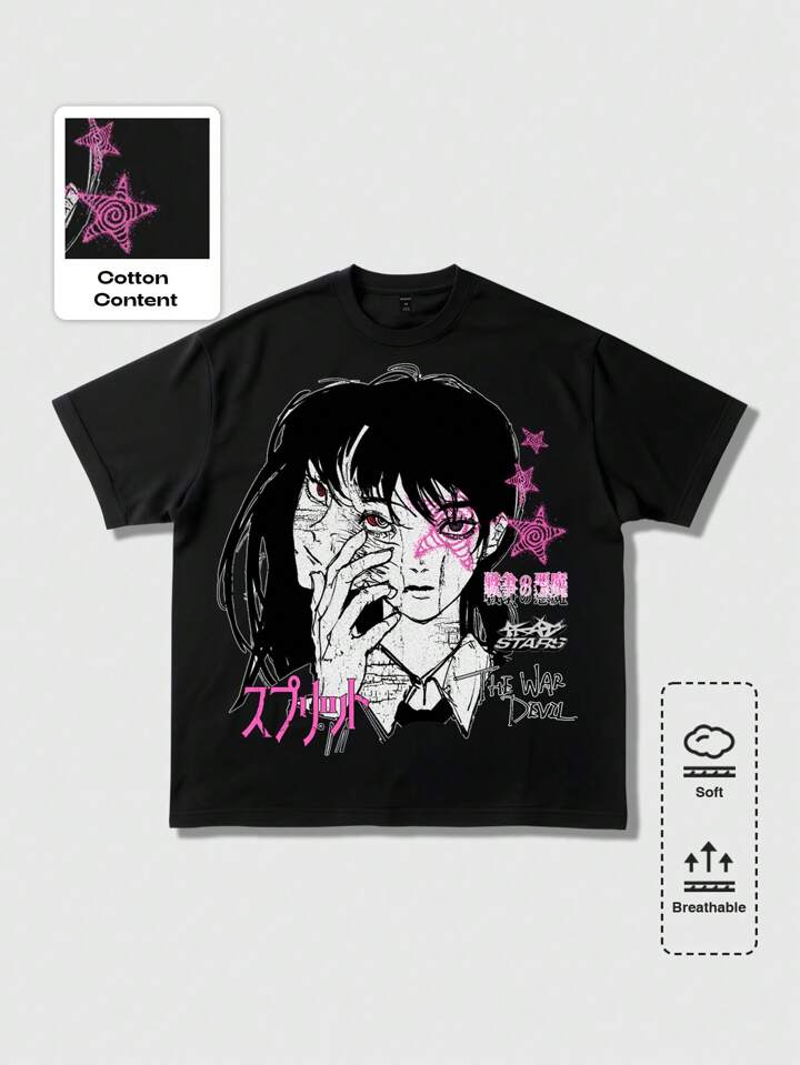 Men Anime Character Portrait Short Sleeve T-Shirt, Cartoon Girl Graphic Print Unisex Round Neck Casual Tee For Men & Women, Japan Style