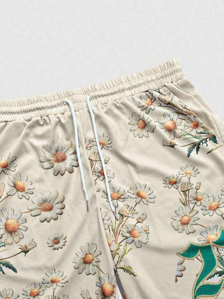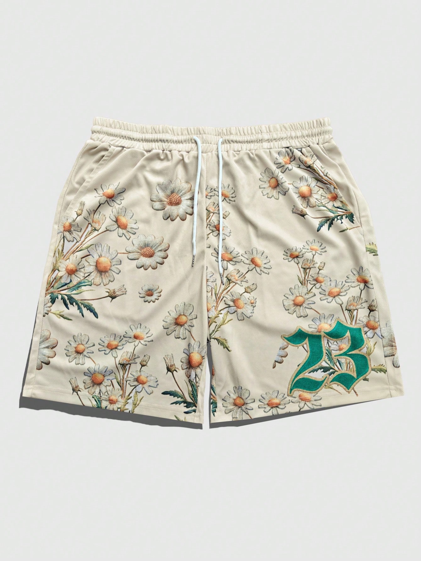 Men Apricot Embroidered Floral Graphic Print Casual Shorts Vacation