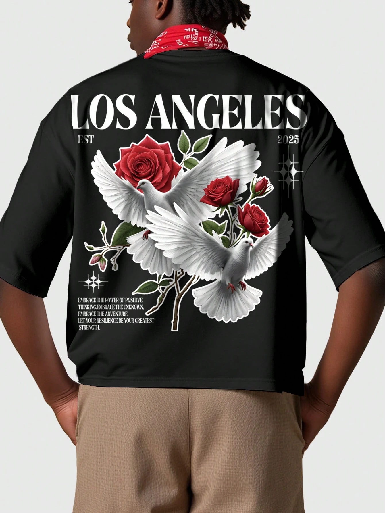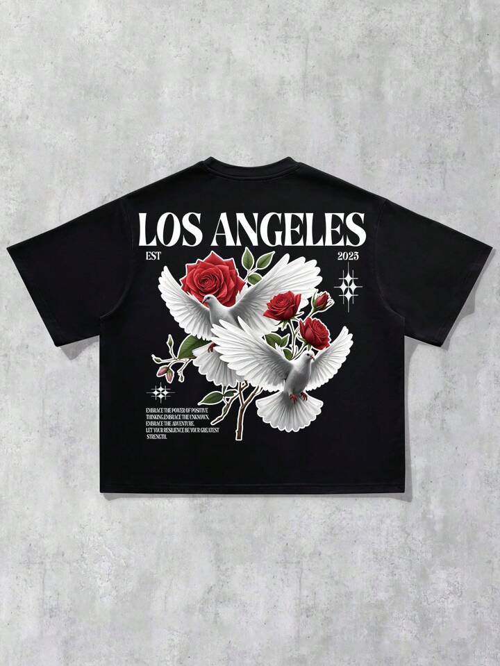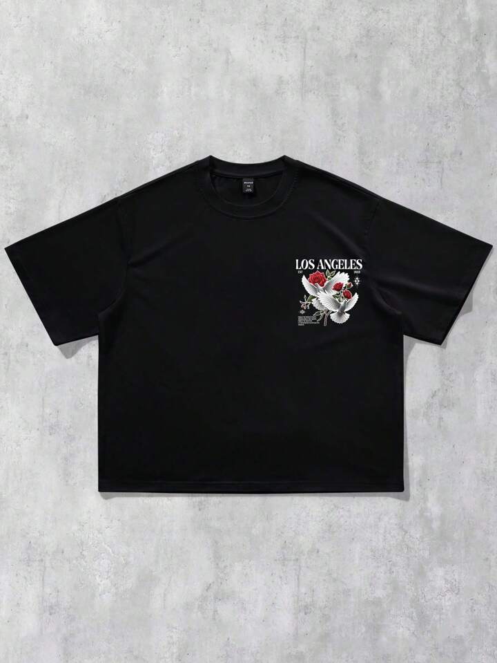 Men Vacation Sportswear Casual Black T-Shirt, White With Spreading Wings Design, Soft And Smooth Fabric With Slight Sheen, Overall Fashionable And Modern Aesthetic
