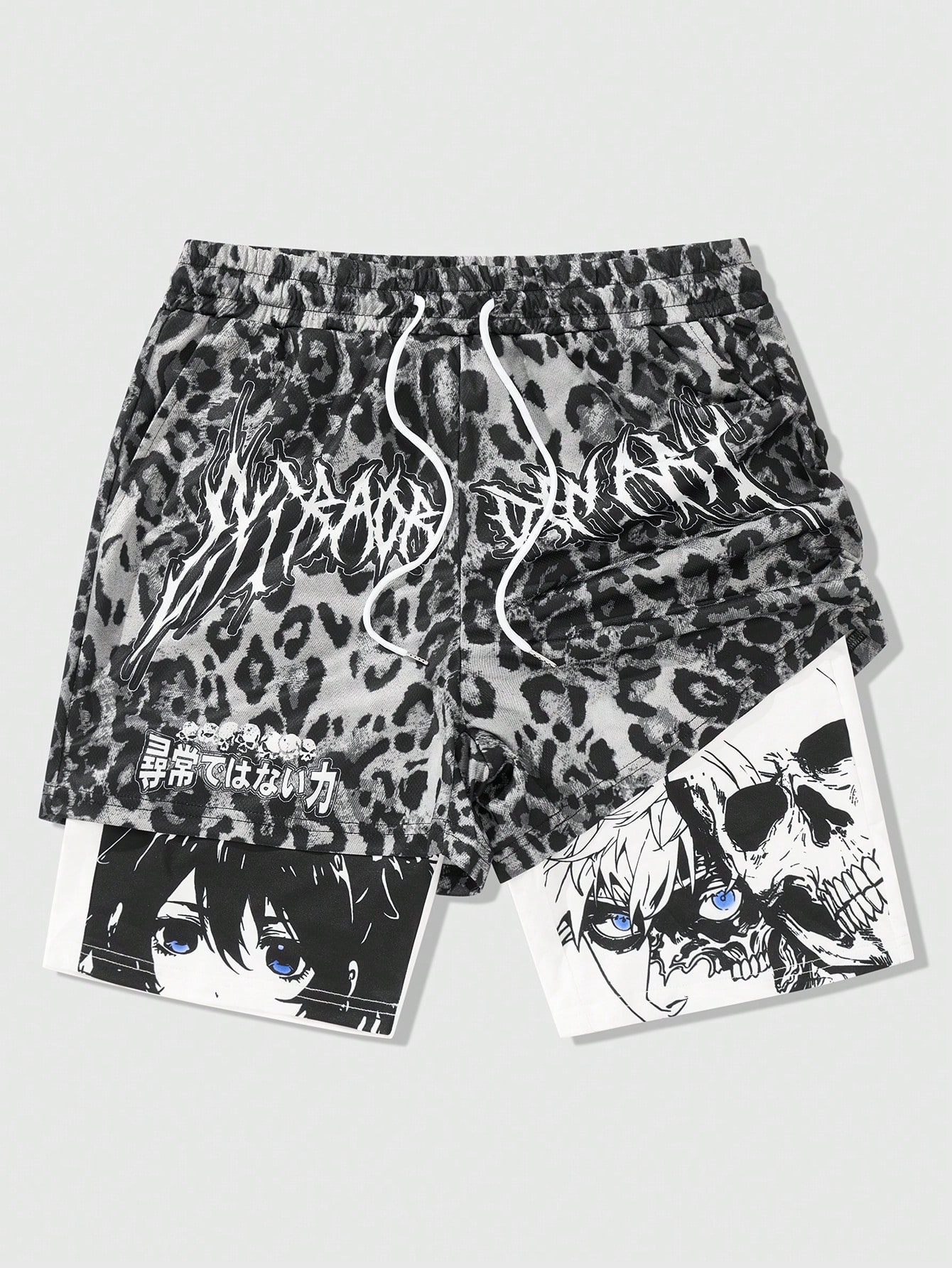 Men's 2 In 1 Anime Character & Vintage Animal Leopard Print Patterned Shorts, Suitable For Everyday Wear In Spring/Summer