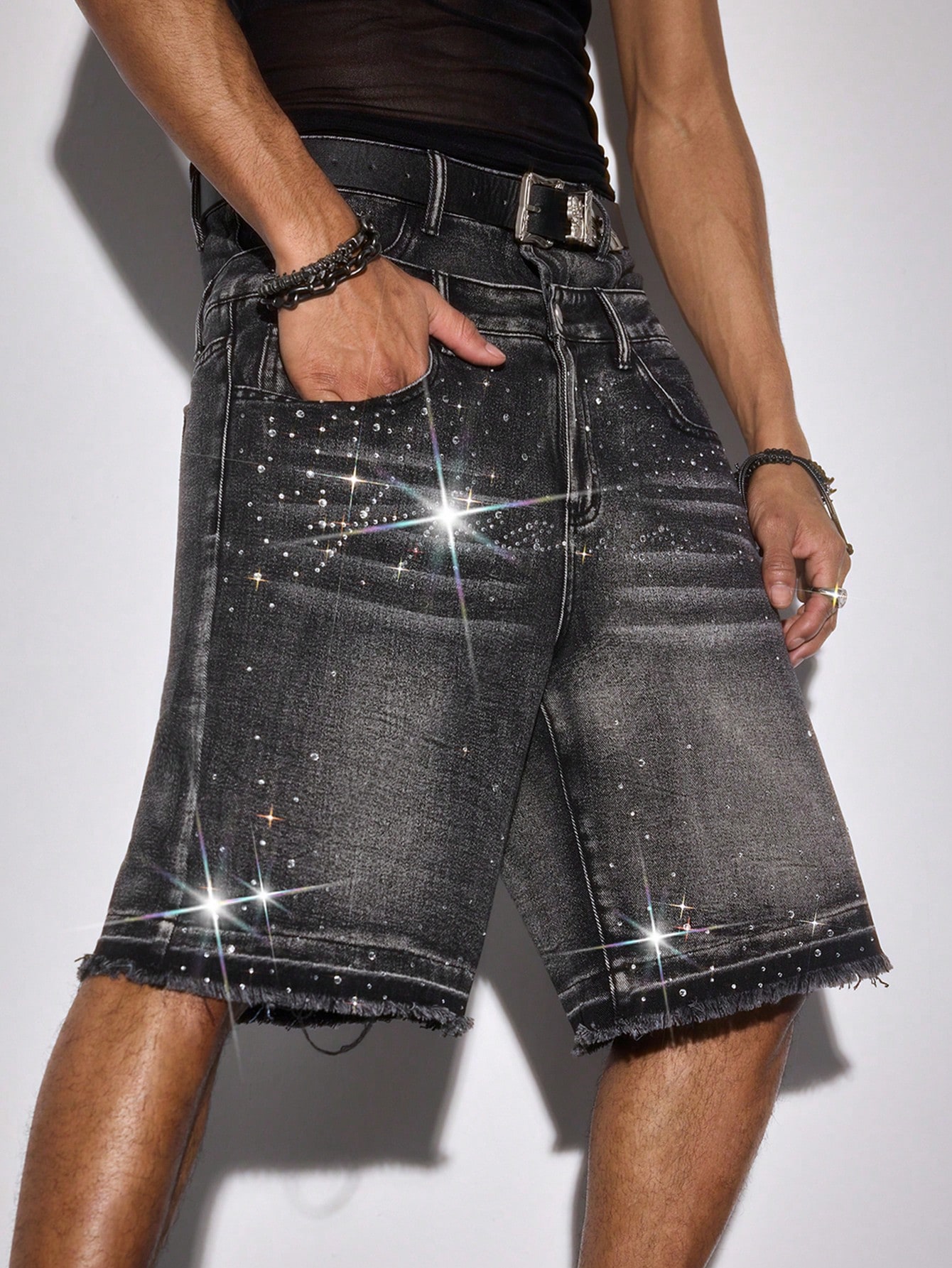 Men's Casual Fashion Distressed Rhinestone Denim Shorts With Pockets