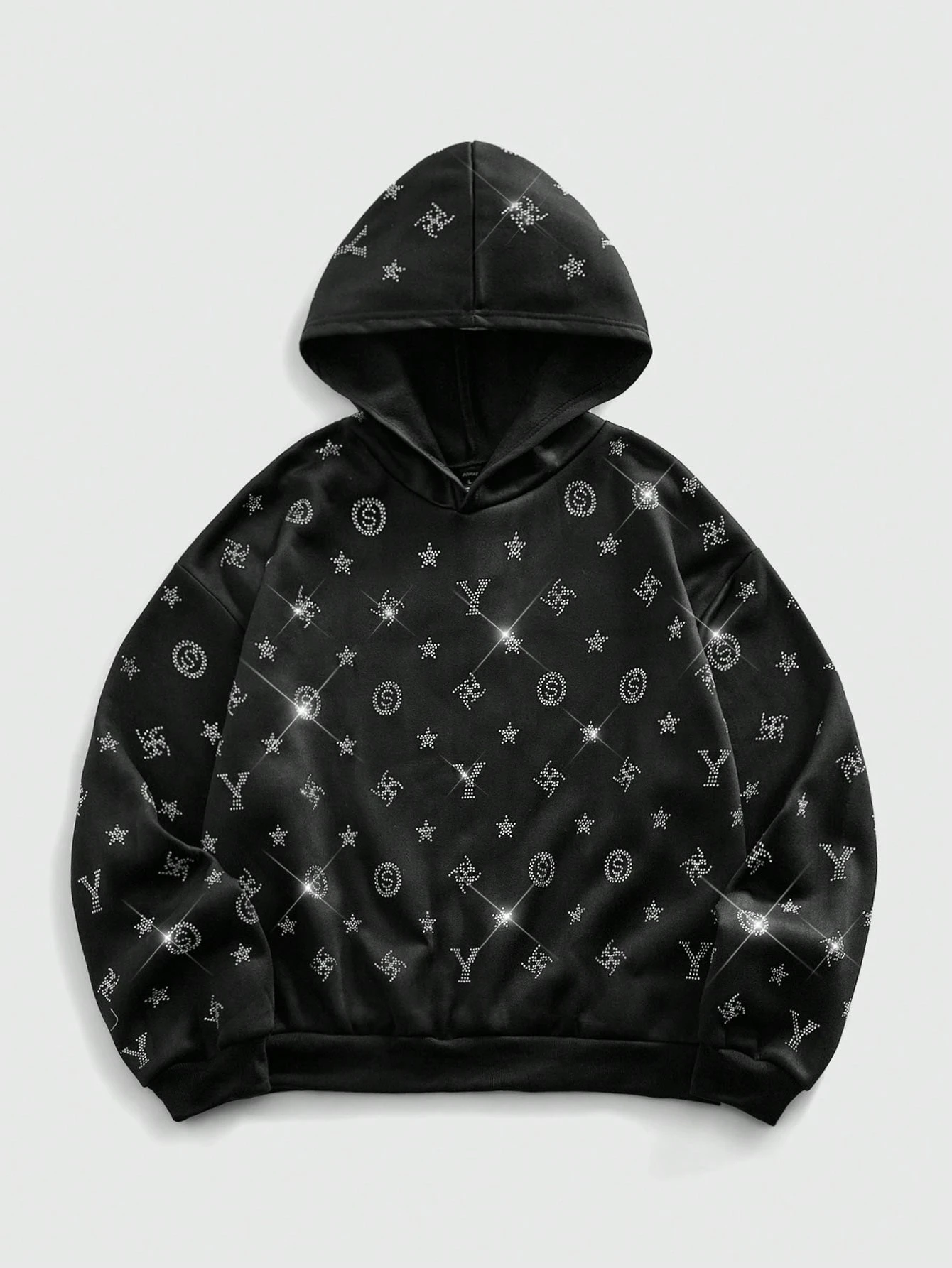 Men's Casual Oversized Hoodie With Rhinestone Embellished Pattern, Loose Fit Warm Thermal Lined, Suitable For Autumn/Winter