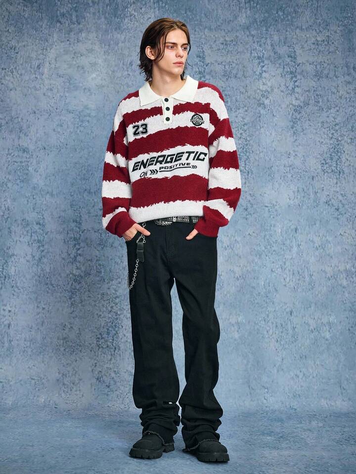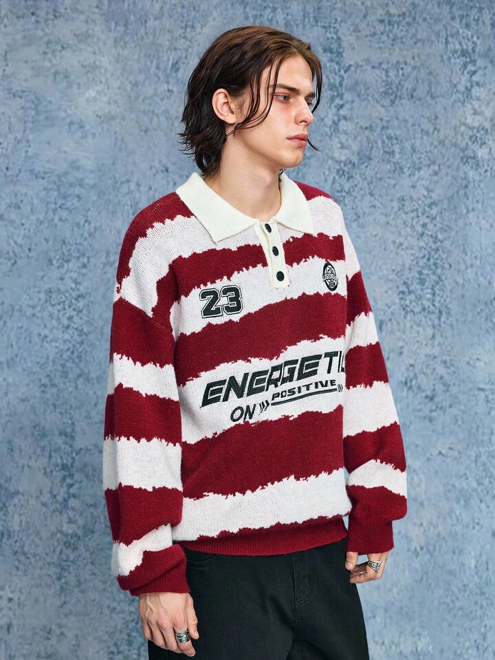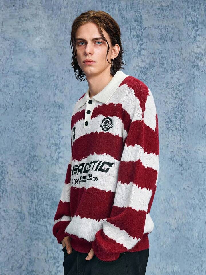 Men's Casual Prep Letter & Striped Drop Shoulder Long Sleeve Polo Neck Sweater, Autumn