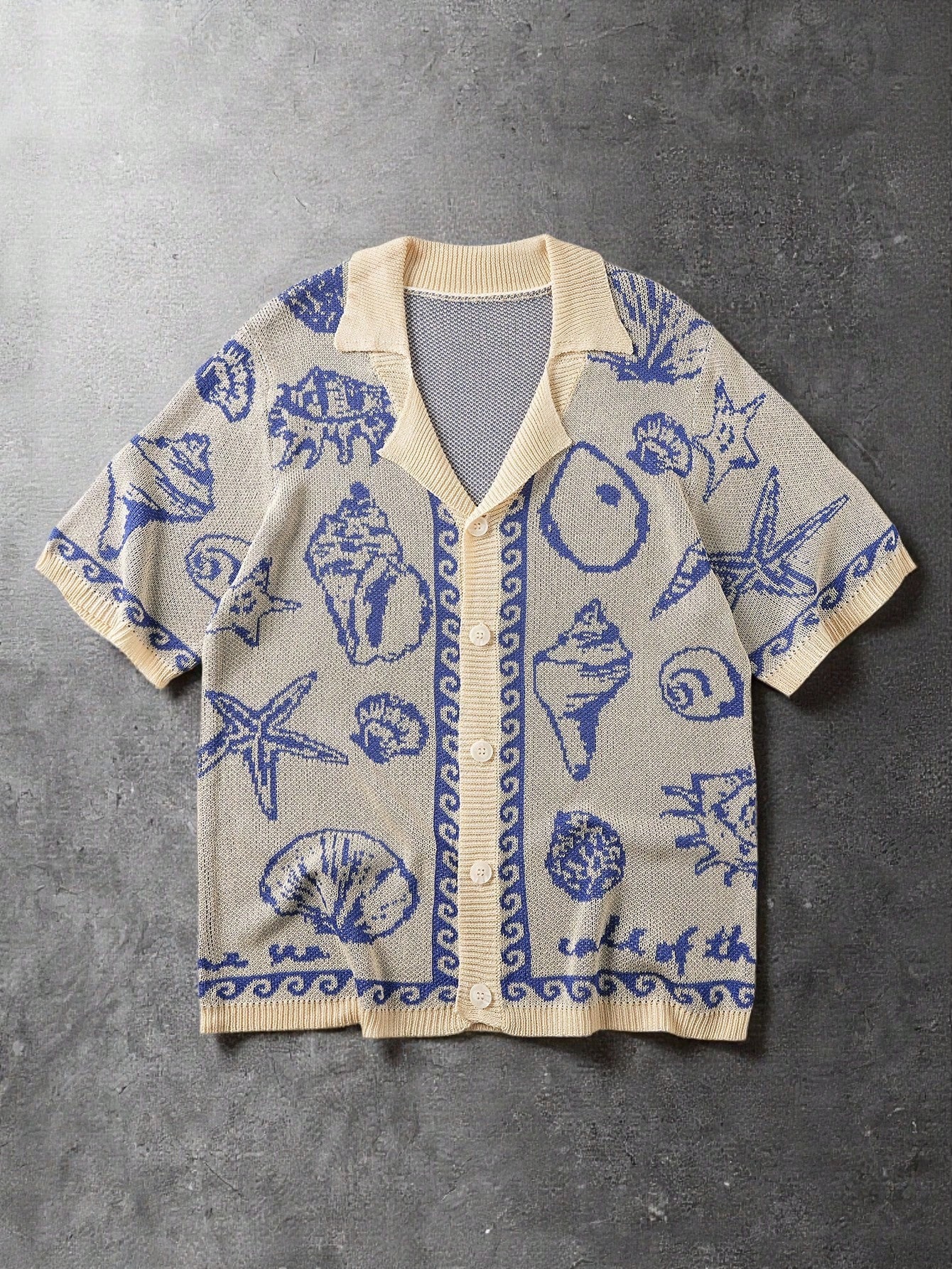 Men's Casual Vacation Style Seashell & Starfish Pattern Lapel Collar Short Sleeve Knit Top, Summer