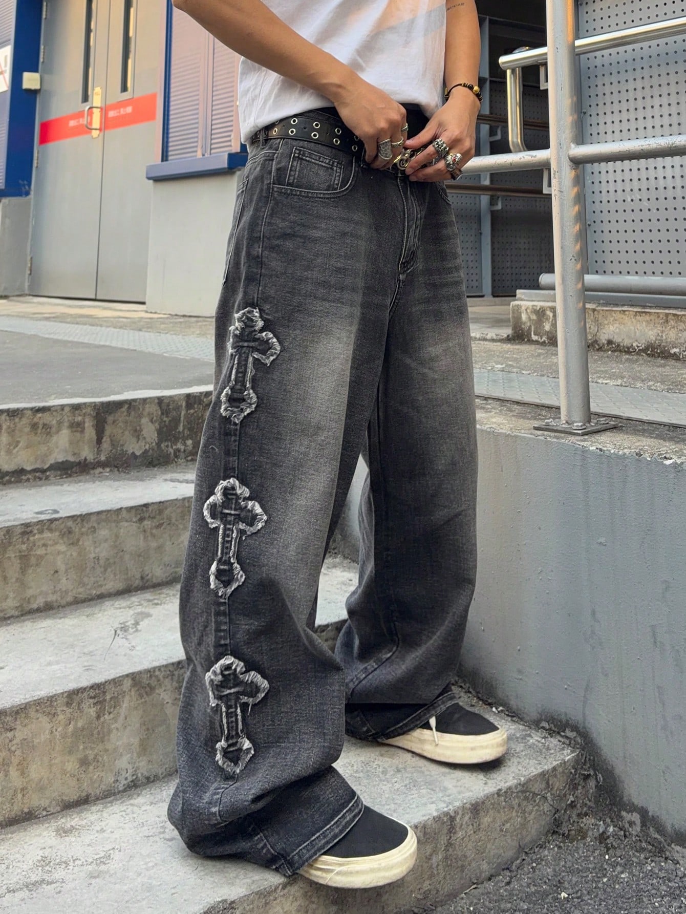Men's Cross Patch Pocket Frayed Hem Wide Leg Loose Casual Jeans