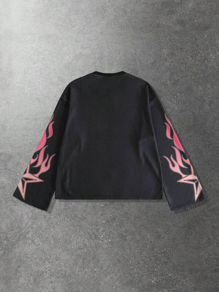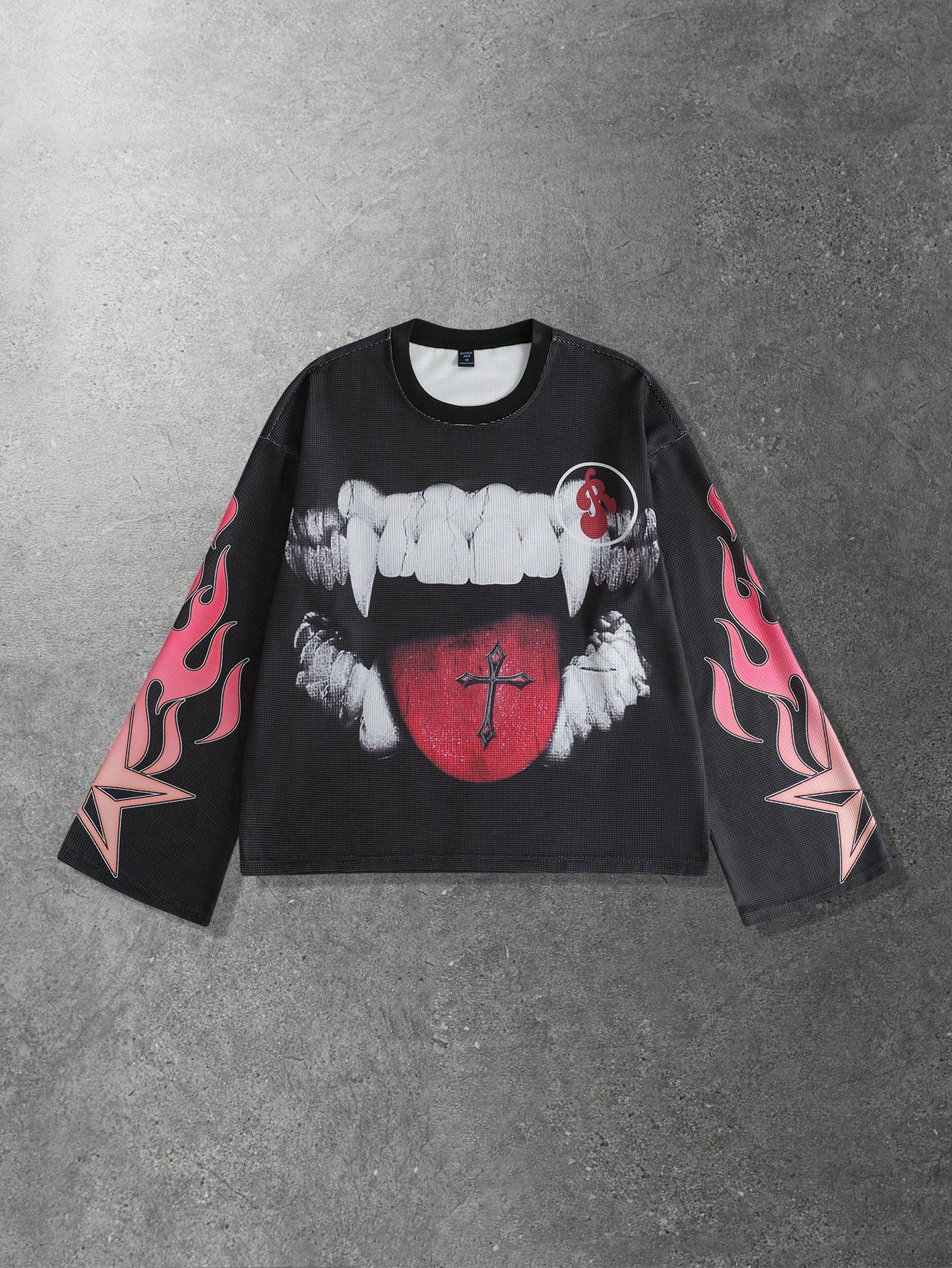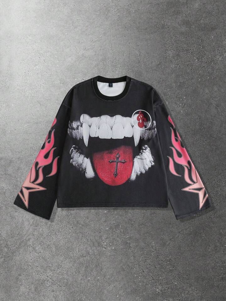 Men's Flame Teeth Print Crew Neck Long Sleeve T-Shirt, Loose Fit