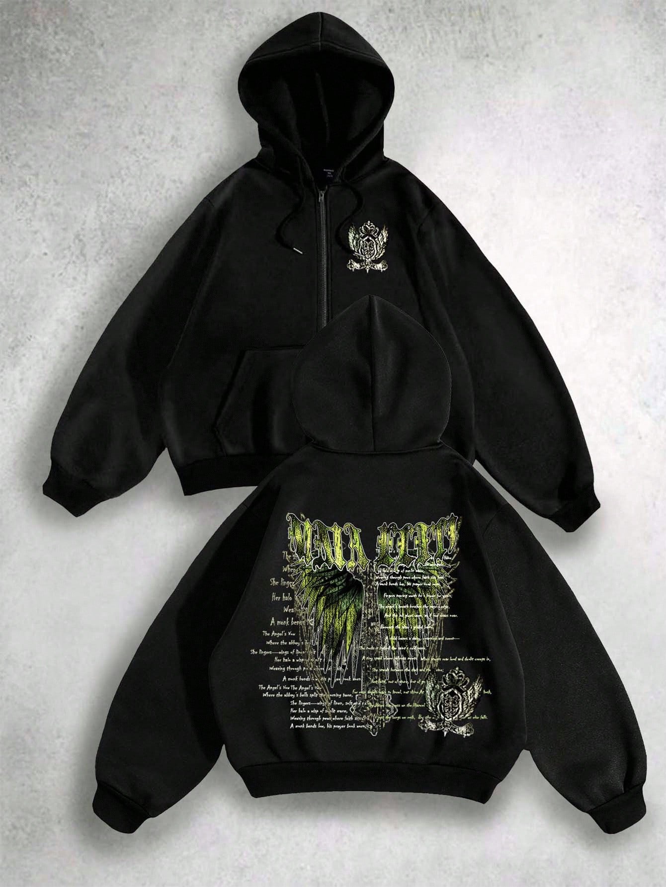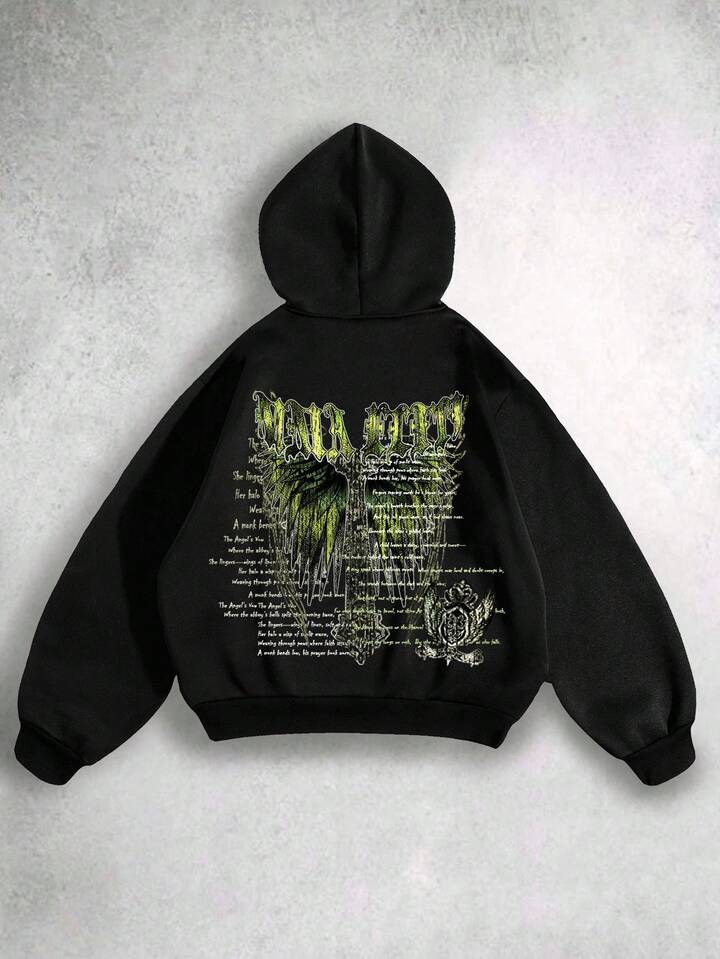 Men's Fleece Gothic Green Feather Wing Slogan Print Hoodie, Fall/Winter