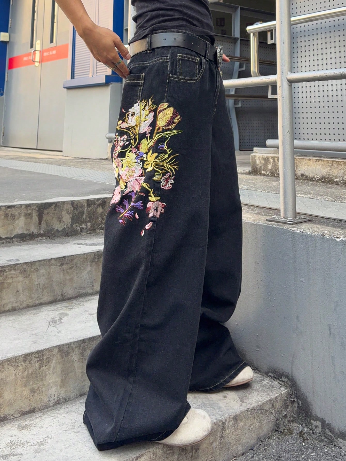 Men's Floral Embroidered Pocket Wide Leg Loose Casual Jeans