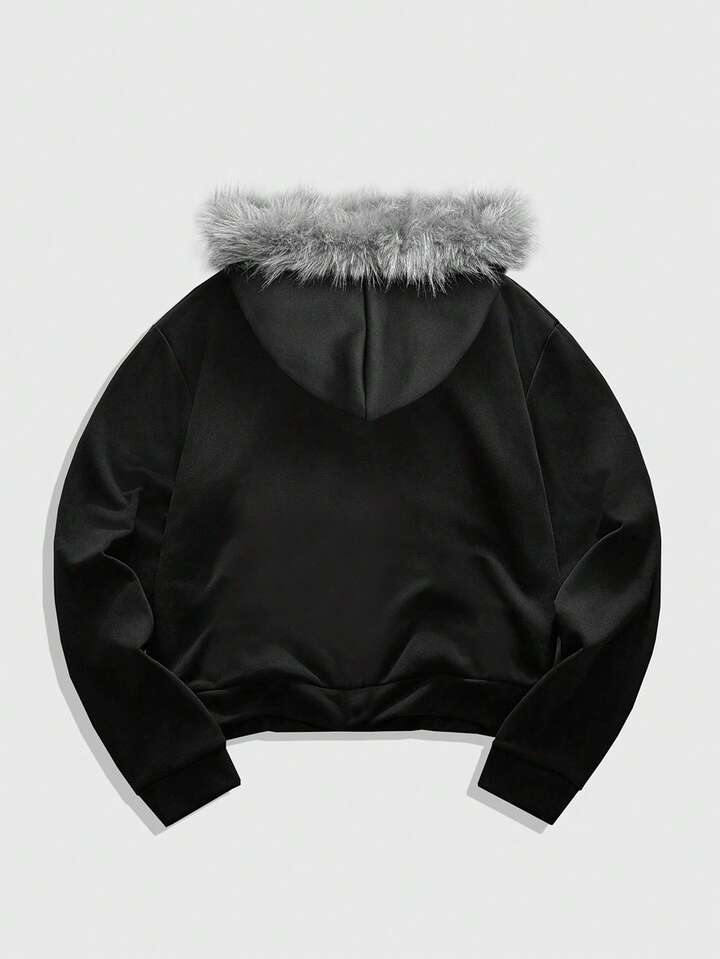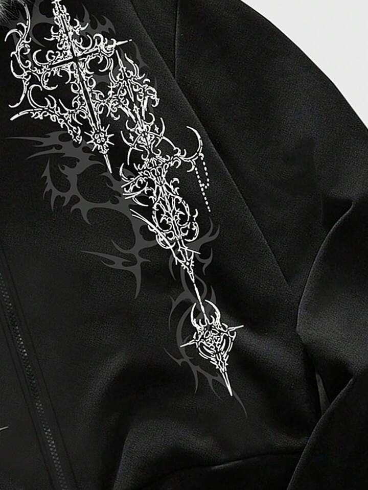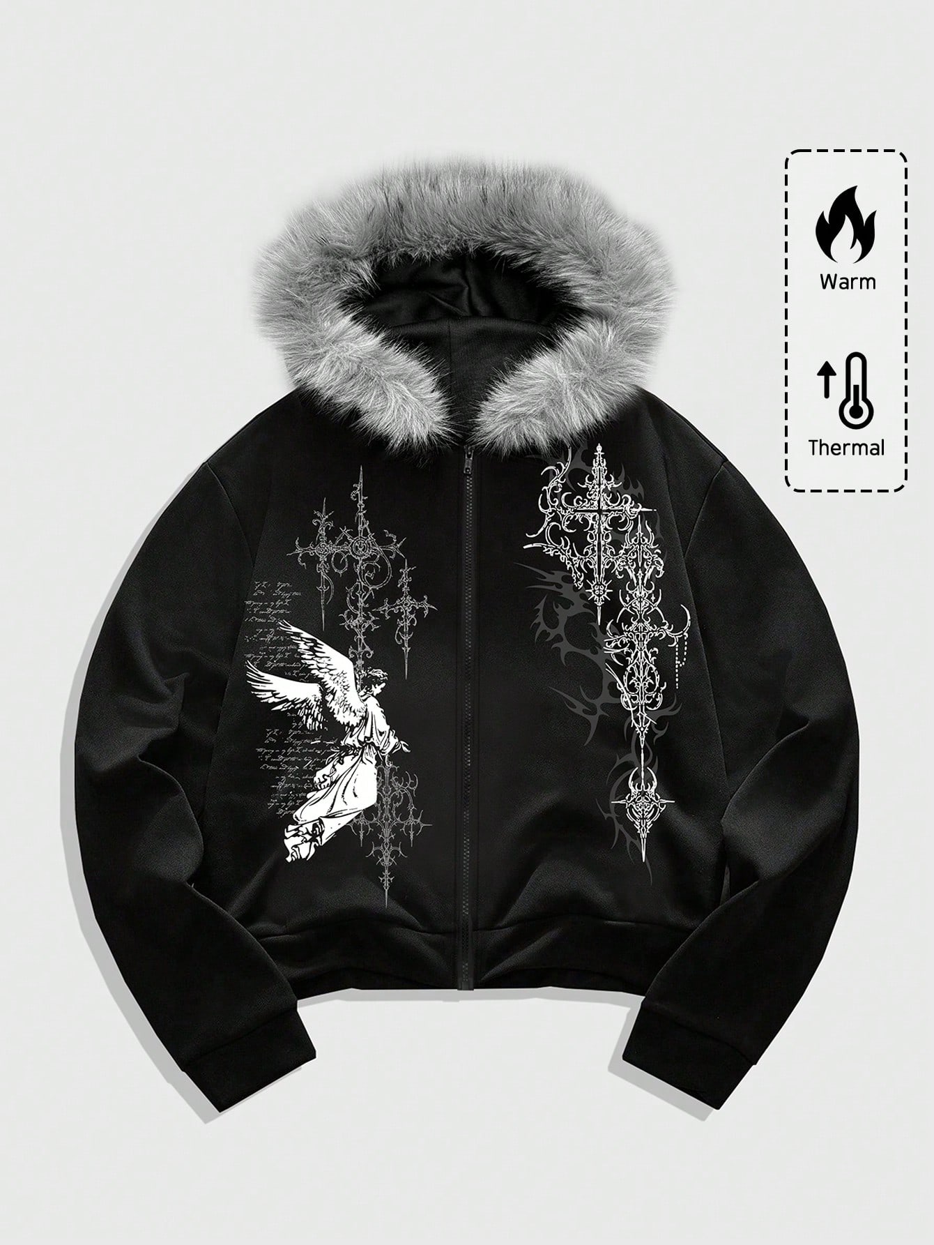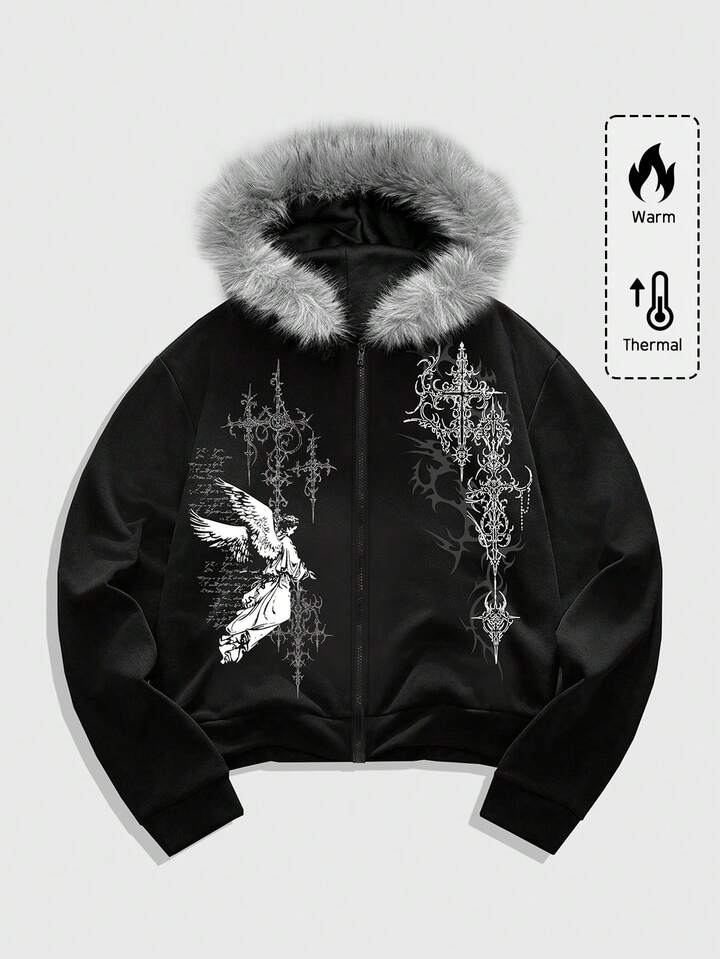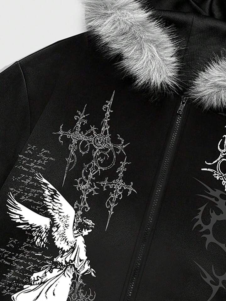 Men's Gothic Fluffy Angel Print Zip-Up Hoodie Sweatshirt, Autumn
