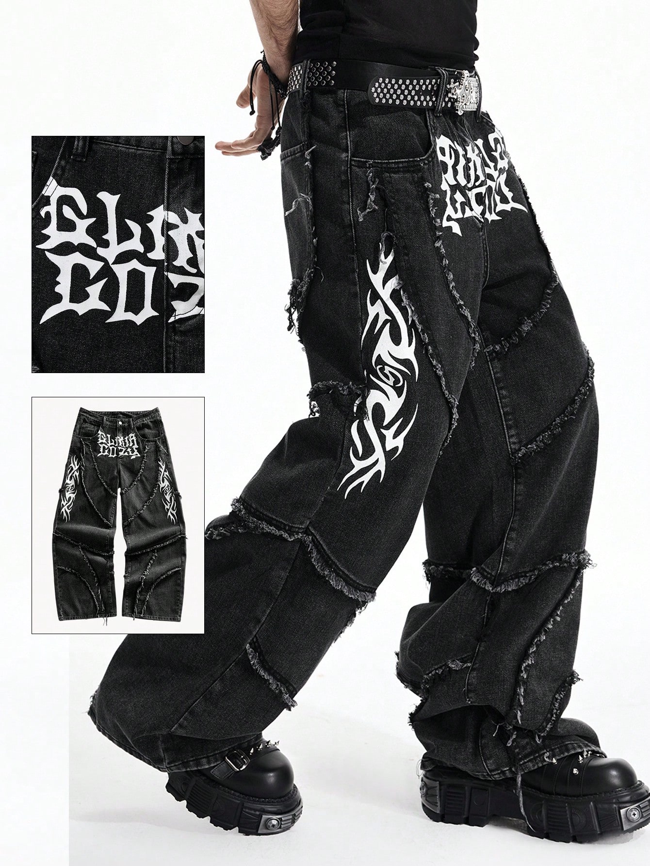 Men's Letter Print Patchwork Frayed Pocket Wide Leg Loose Casual Jeans