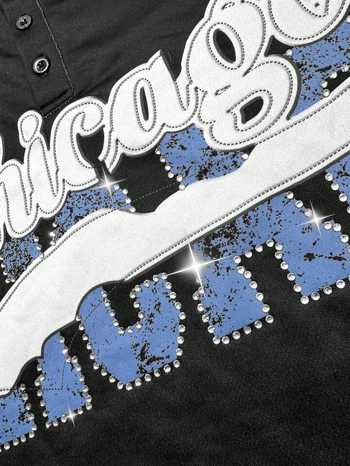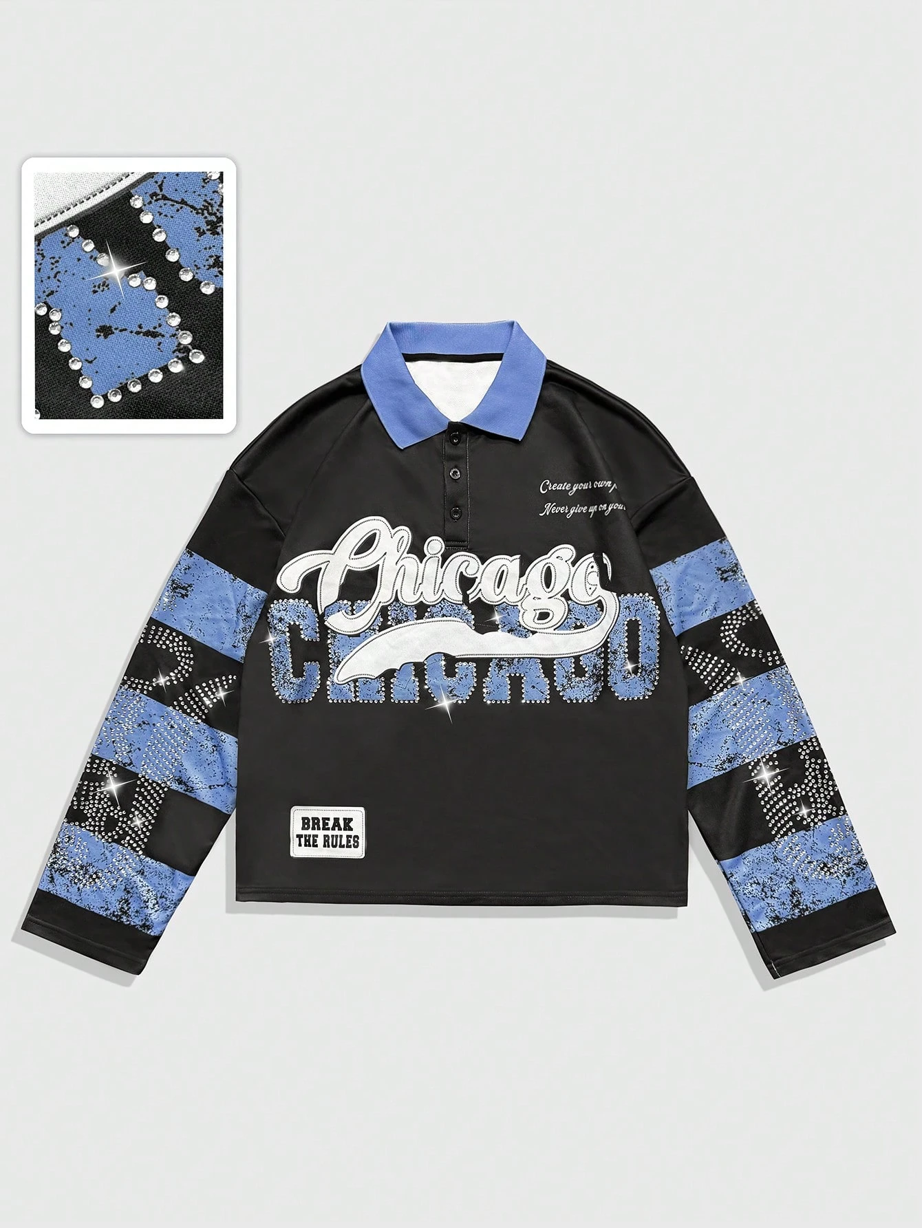 Men's Letter Print Rhinestone Design Long Sleeve Casual Polo Shirt