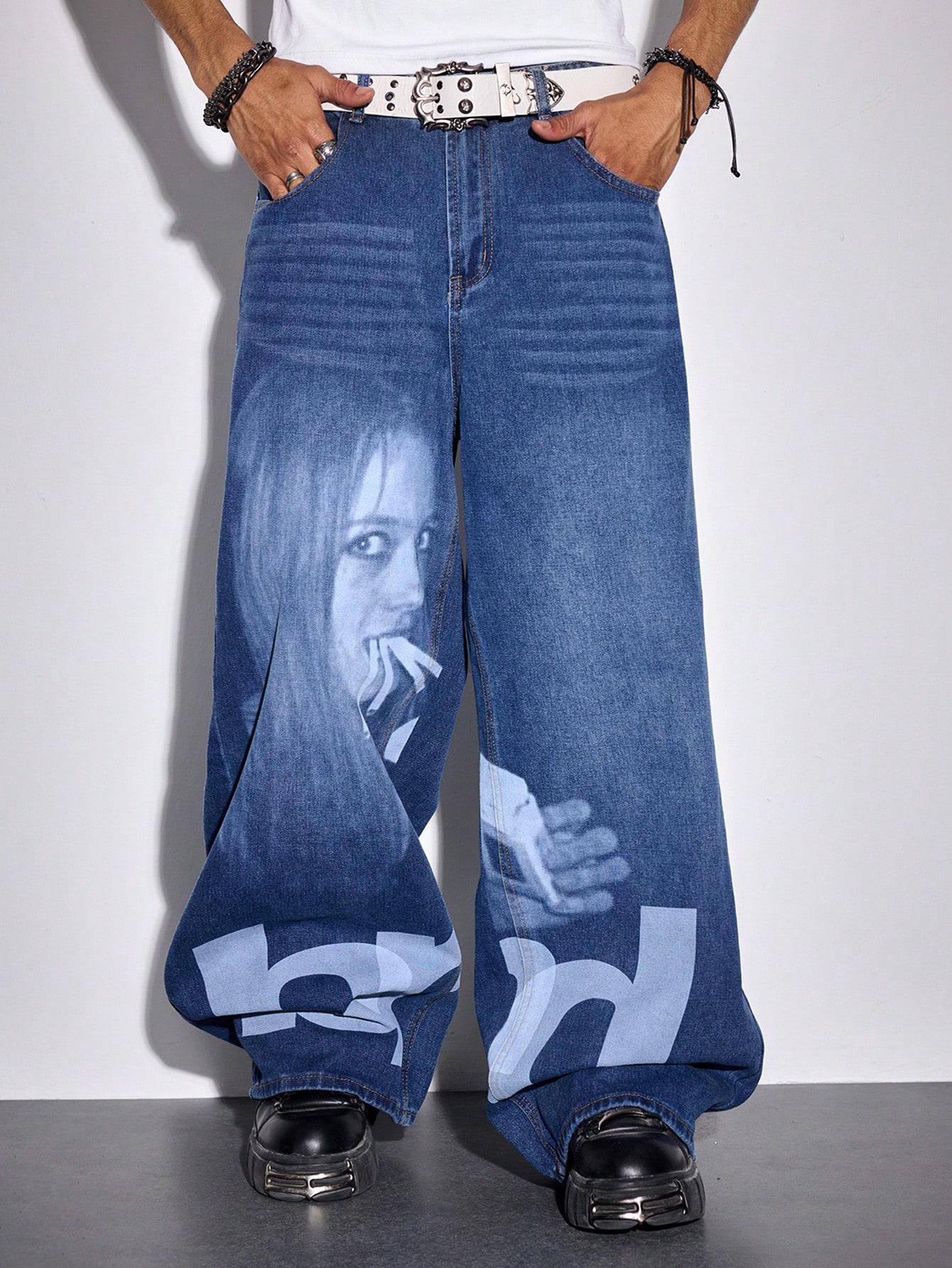 Men's Loose Fit Graphic Pocket Wide Leg Casual Jeans
