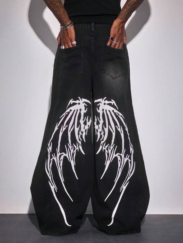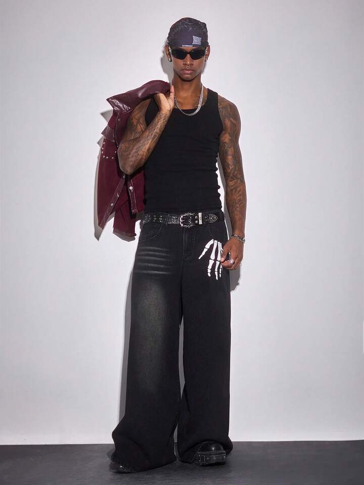 Men's Loose Fit Skull Hand Graphic Pocket Wide Leg Jeans