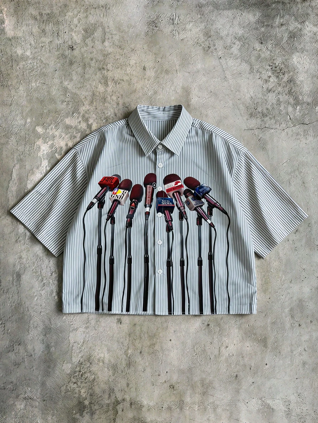 Men's Microphone Print Striped Short Sleeve Shirt, Retro Street Style