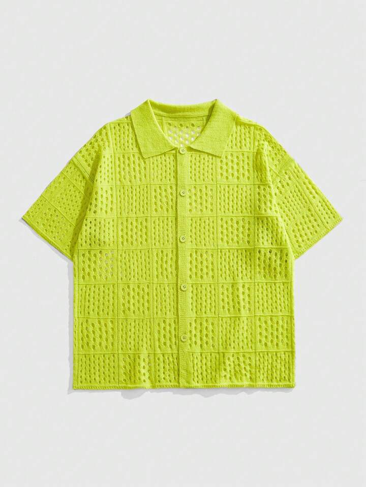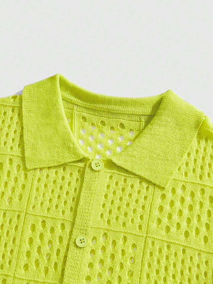 Men's Short Sleeve Hollow-Out Cardigan Casual Knit Top, Suitable For Daily Wear, Vacation